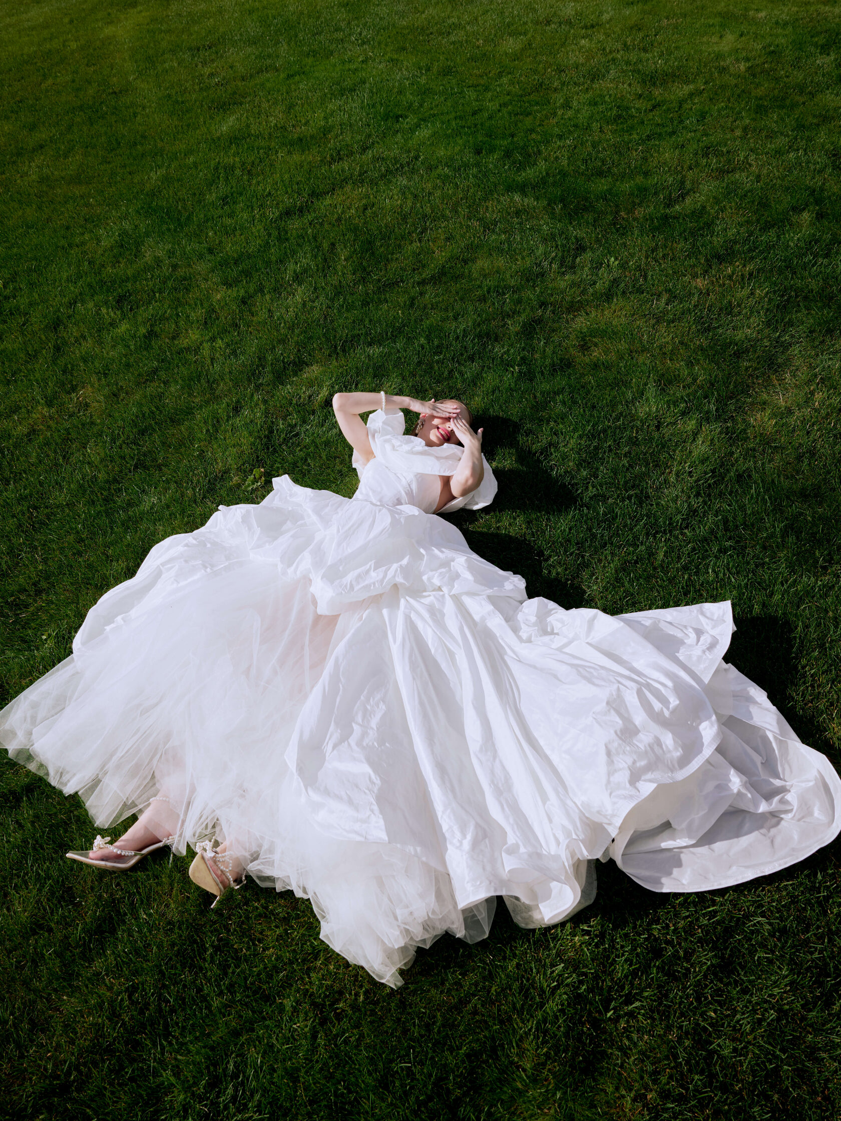 A-silhouette wedding dress is completed with a removable flounce that is fastened on the upper edge of the corset. The gown has a short skirt with a train and 2 removable skirts of taffeta with a long tulle train.