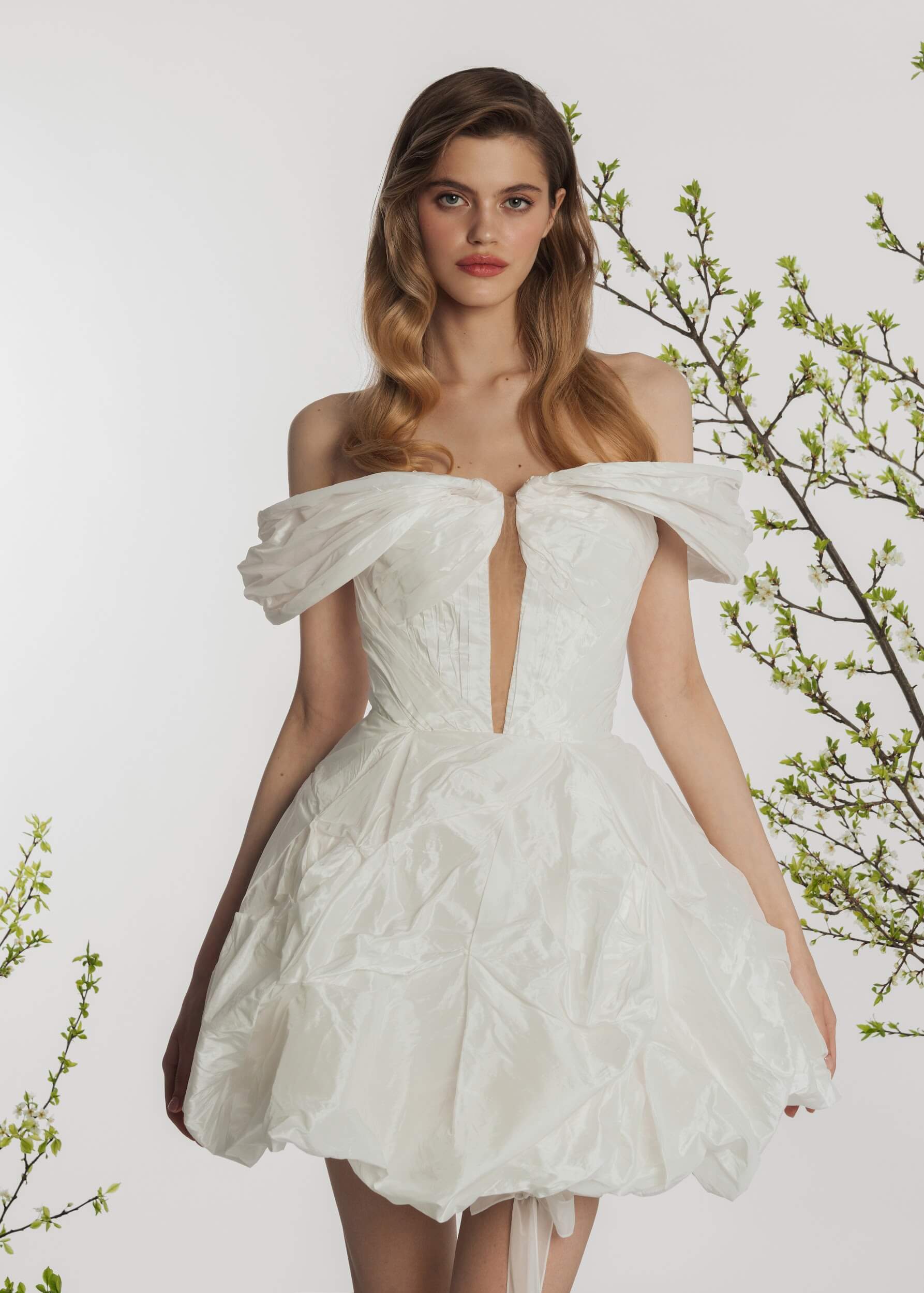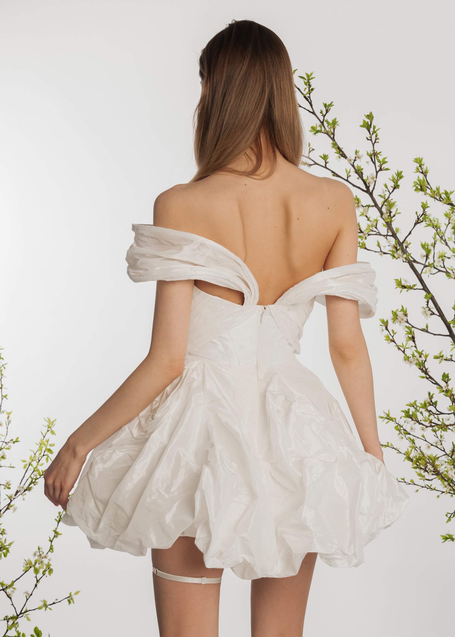 Mini wedding dress with a relief corset with lace cups, a voluminous asymmetrical skirt adorned with rosette drapery, creating a unique look. Additionally, we offer a maxi skirt variation for added charm.