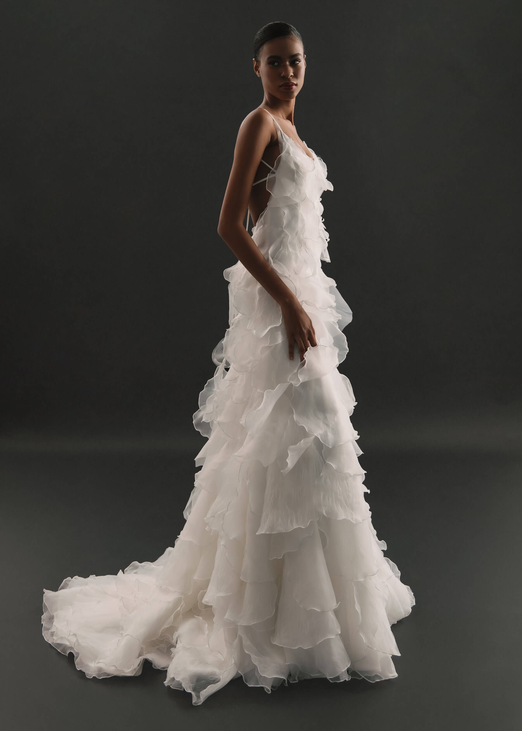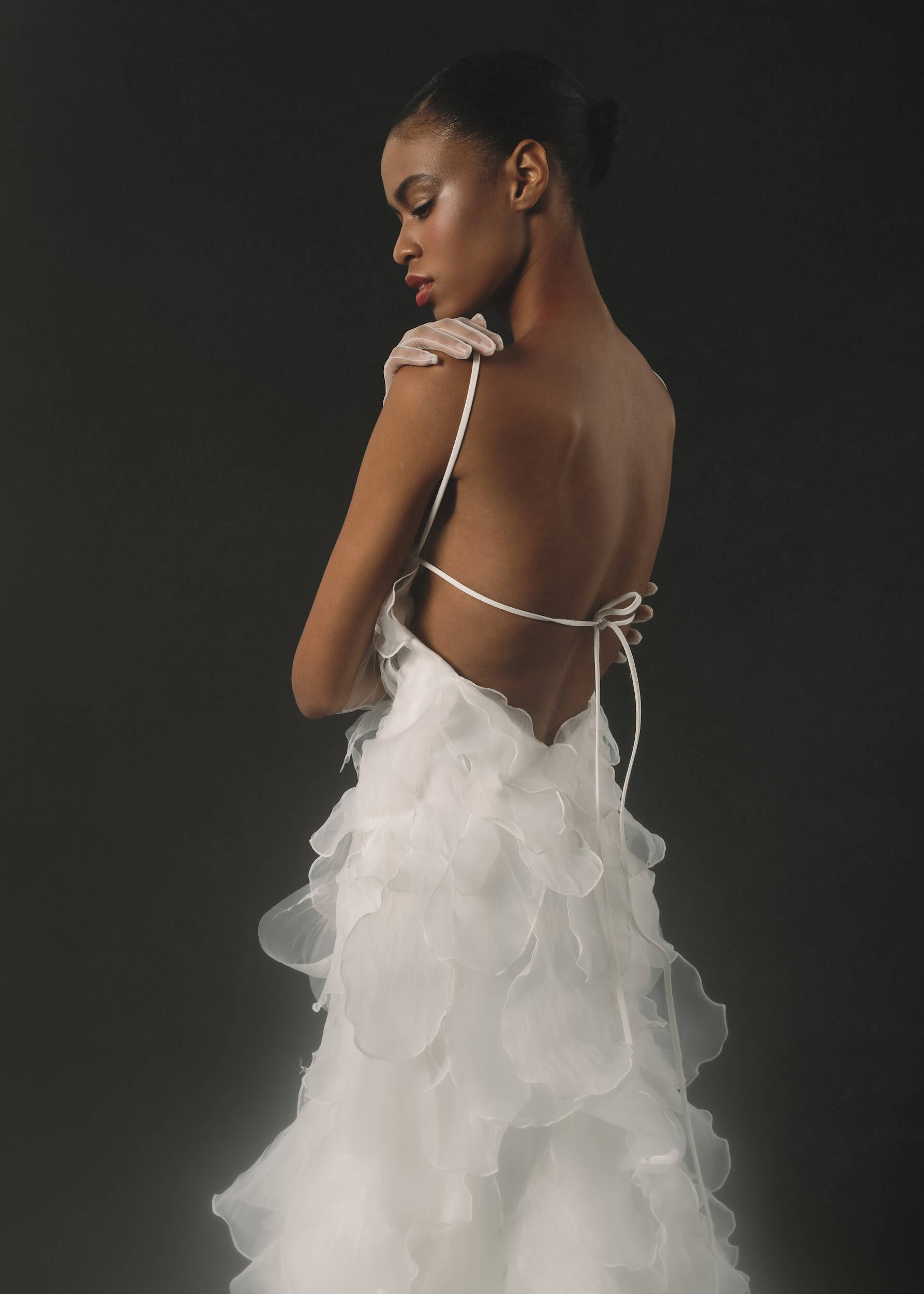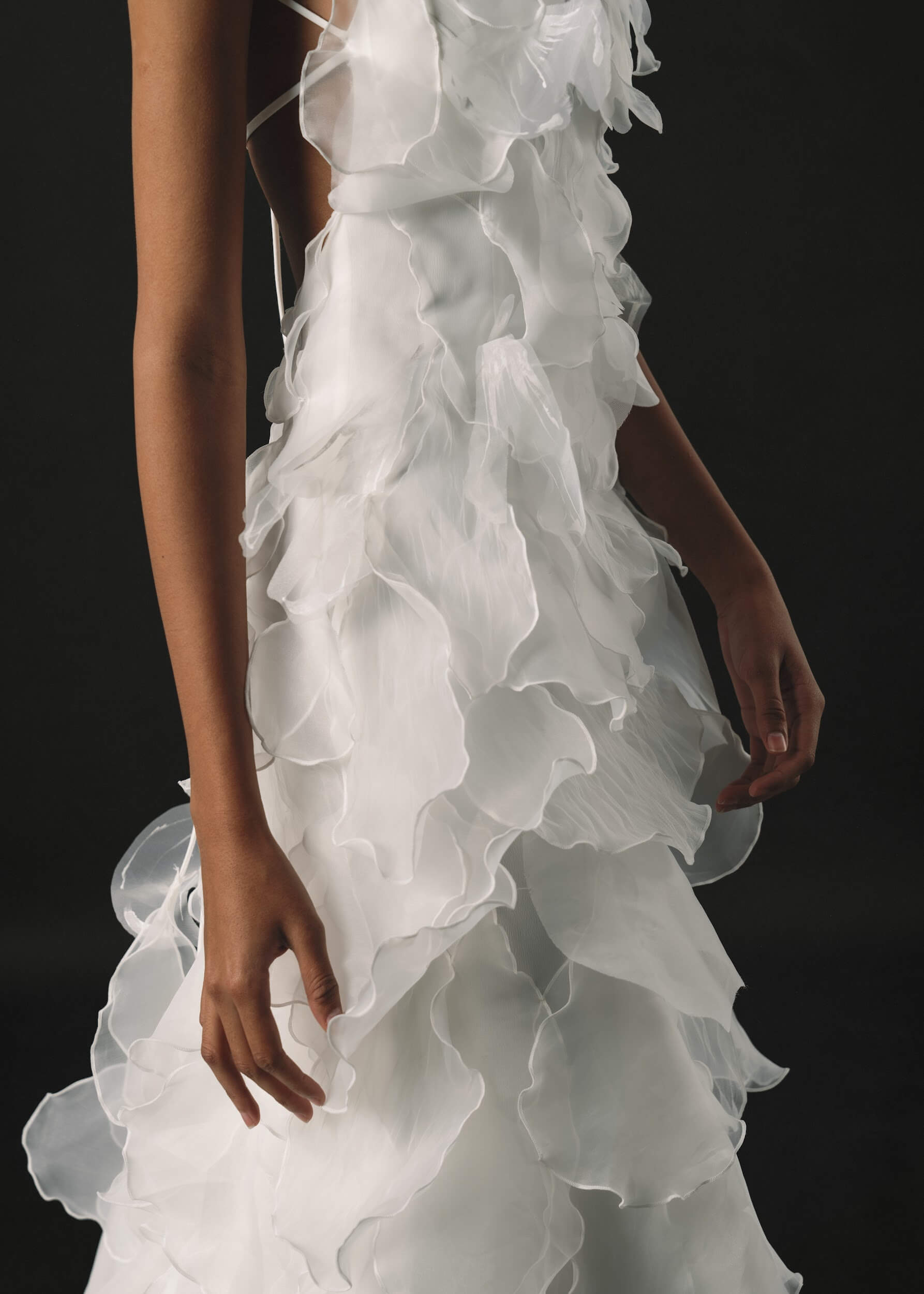 Graceful wedding dress with intricate relief patterns and organza petals exudes unique femininity and elegance. The silhouette is fitted, with a concealed zipper and hook for closure.