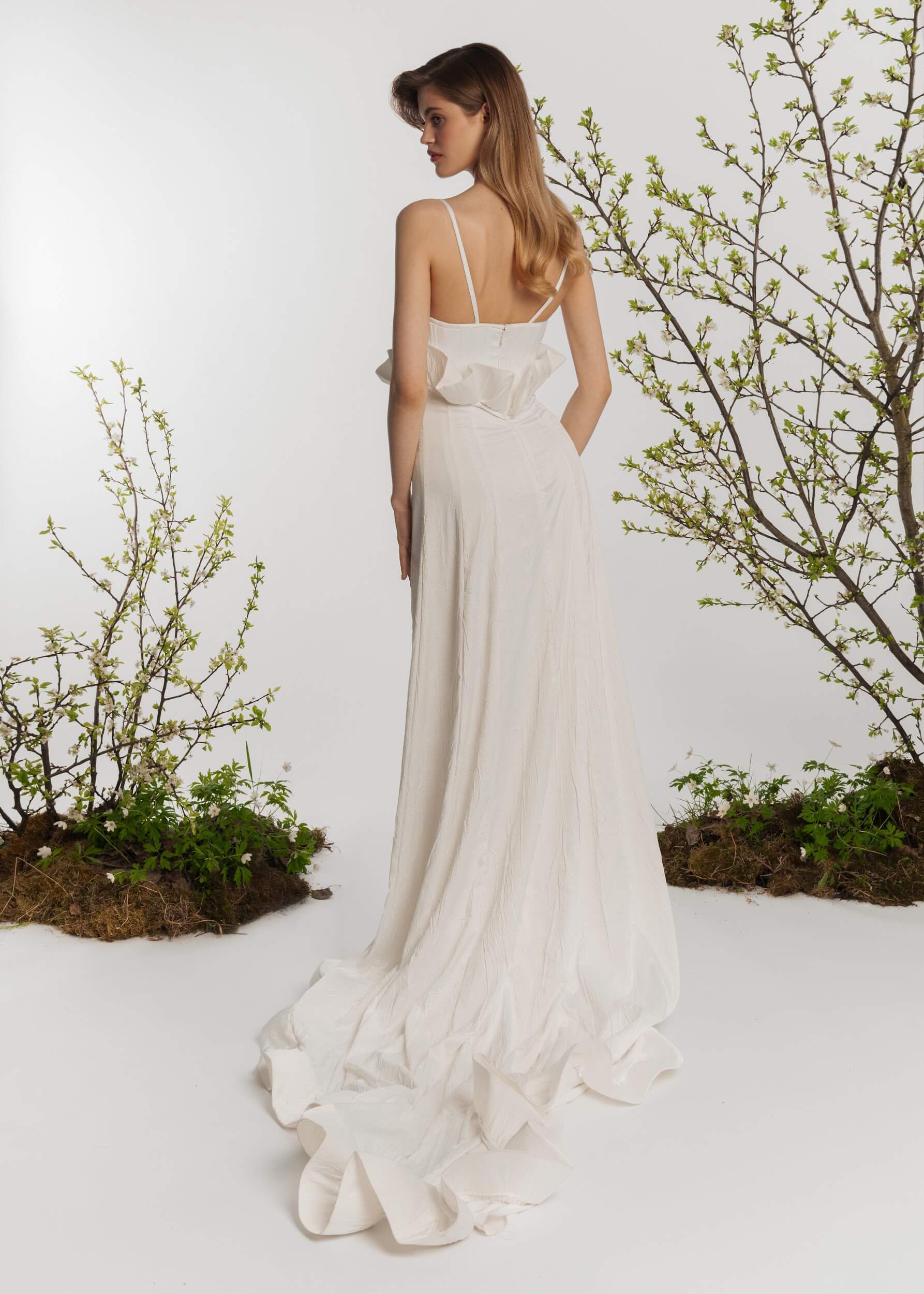 A-silhouette wedding dress with handmade decorative angels on the corset. The dress has a train. A variation of the dress in smooth milky thin satin is possible.