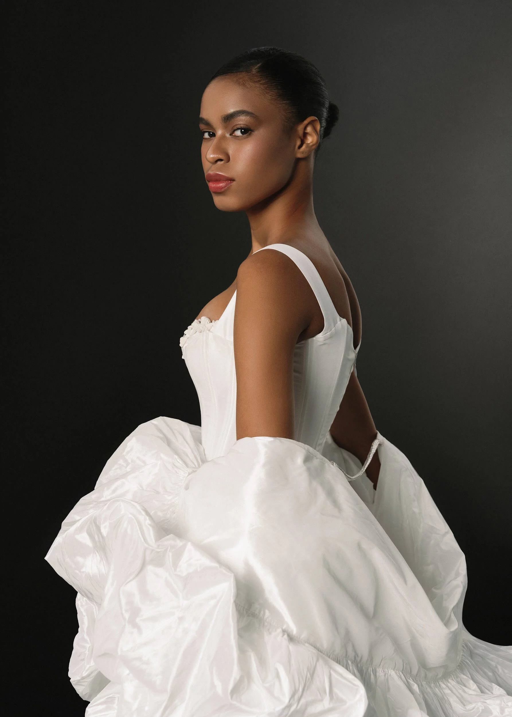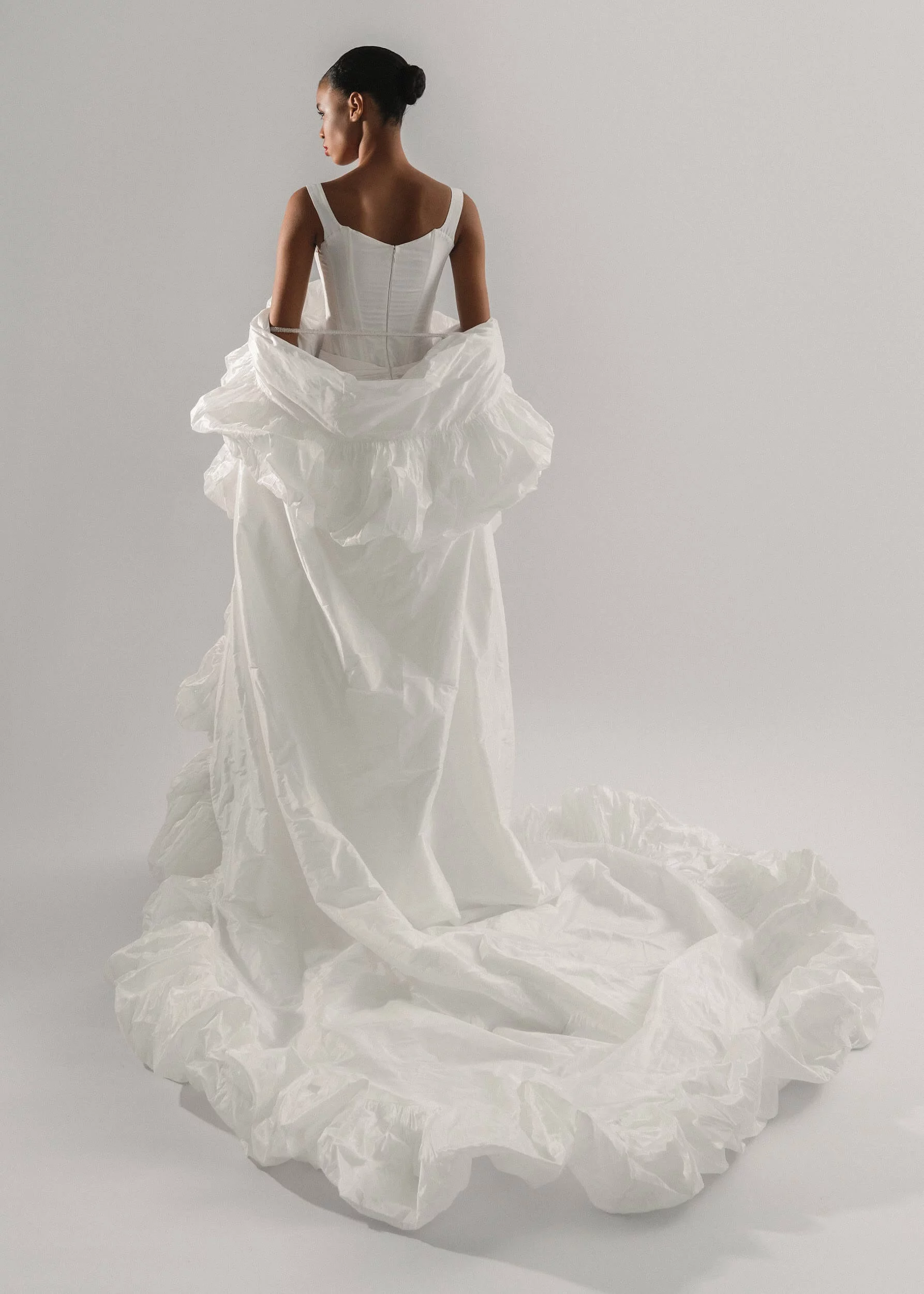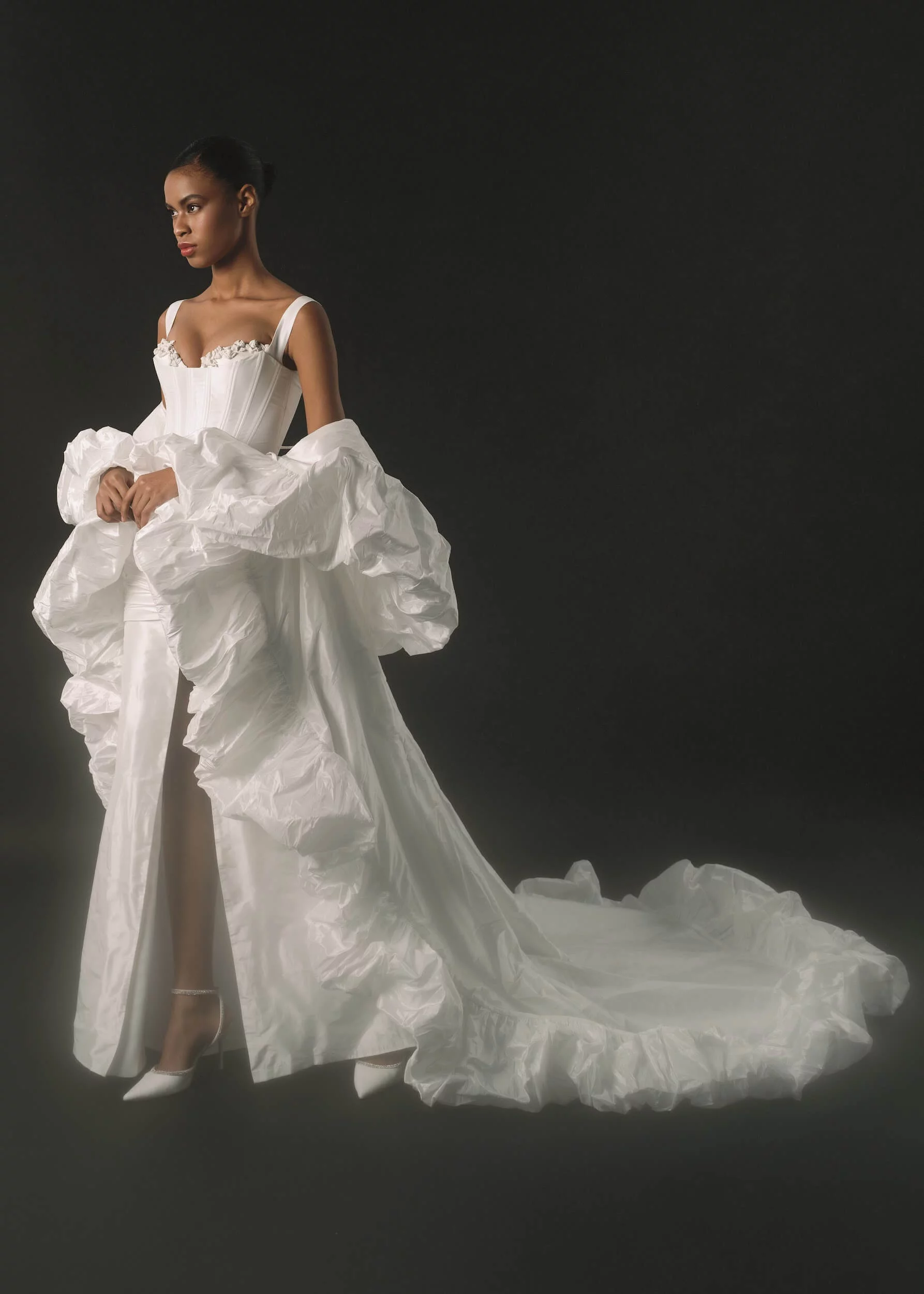 A voluminous cape with a train. The back is embroidered with a decorative hanging braid.
