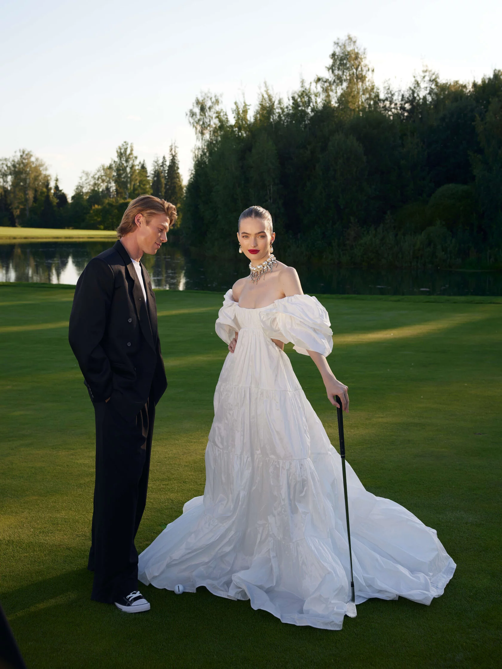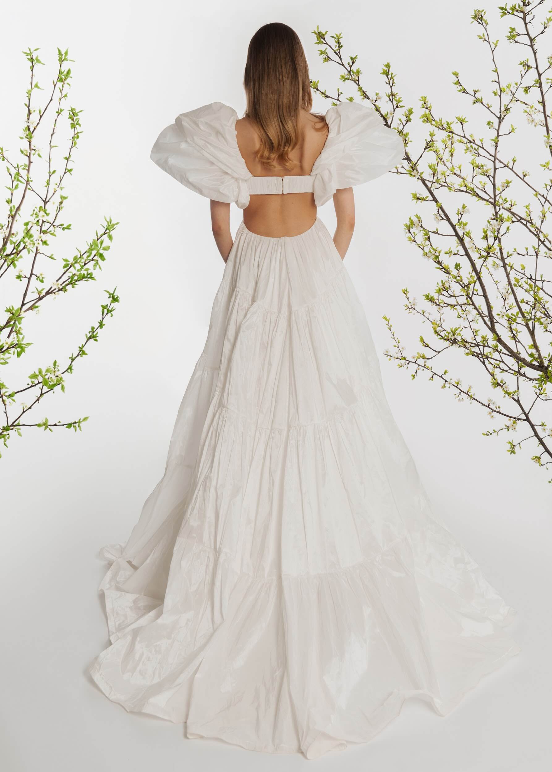 A-silhouette wedding dress with a full skirt with a train. The gown has detachable voluminous sleeves. There is drapery around the corset.