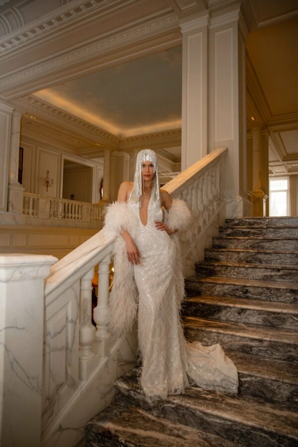 Mermaid-style wedding dress with a train extended by a shaped godet, designed without a waist seam. The front features sculpted seams and a deep U-shaped neckline, covered with powder-toned nylon. The bodice fastens at the neck with hooks and a clear button; the back closes with a hidden zipper. Silver Chantilly lace beneath the main layer adds a subtle shimmer. The dress is lined with semi-sheer milk-toned chiffon, with soft finishes and an open lace edge.