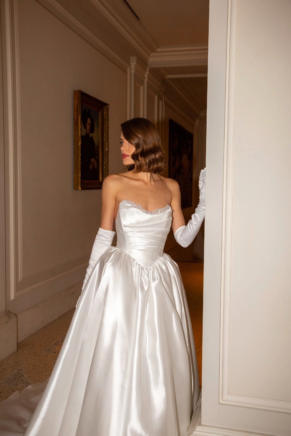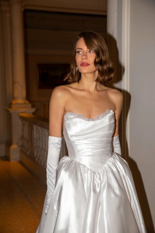 Princess-style wedding dress with a dropped waistline at the front. The bodice features molded cups, a closed lace-up back, and horizontal draping across the front. The neckline is trimmed with scalloped lace and pearls, while the back panels are covered in smooth satin. A voluminous skirt with a train is made of layered tulle and structured mesh, with gathered horsehair inserts for added volume. Optional variations include a plain neckline and removal of side horsehair.
