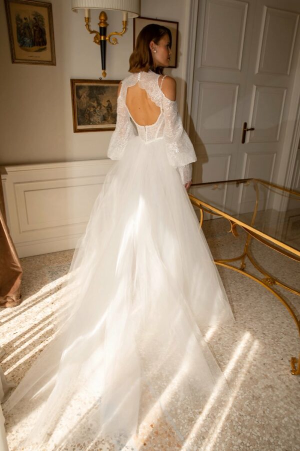 Mermaid-style wedding dress with a semi-sheer effect and a softly dropped waistline at the back. The bodice features molded cups, a closed lace-up back, sequin lace overlay, and is adorned with decorative trim and lace flowers. The midi skirt has an asymmetric cut with sculpted pleats forming a cascading tail and a high slit on the left leg. The look is completed with a fitted bolero featuring puffed sleeves and a high collar, and a detachable voluminous train skirt with shimmering tulle. Available variations include milk-toned details, lace-covered back, and closed back with internal lacing.