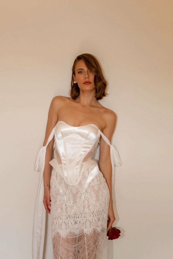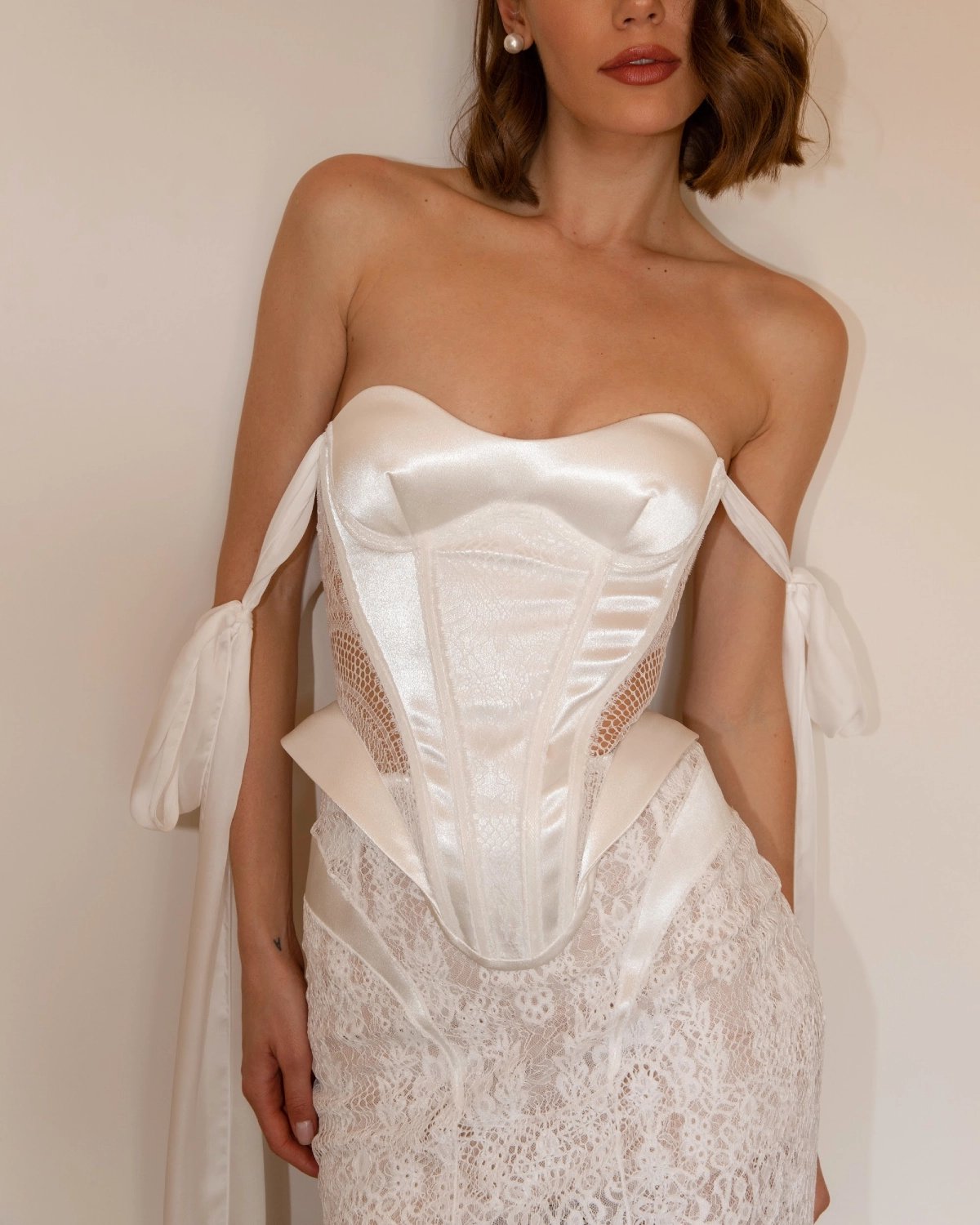 Elegant set for special occasions: a fitted jacket, satin corset, and long mermaid-style skirt with train. The corset is unlined, decorated with lace and Chantilly, and tied with delicate ribbons. The skirt features Chantilly and powder-toned crepe, with vertical satin accents and a mini lining. The mid-hip jacket has an extended shoulder line, tie closure, shaped seams, and flap pockets. Custom adjustments available for corset shape, lining length, and trim.