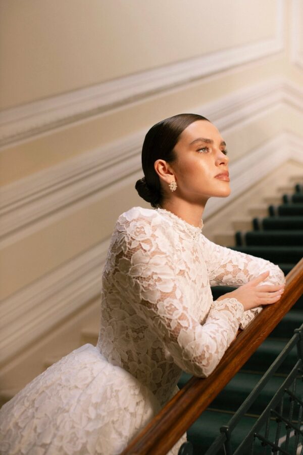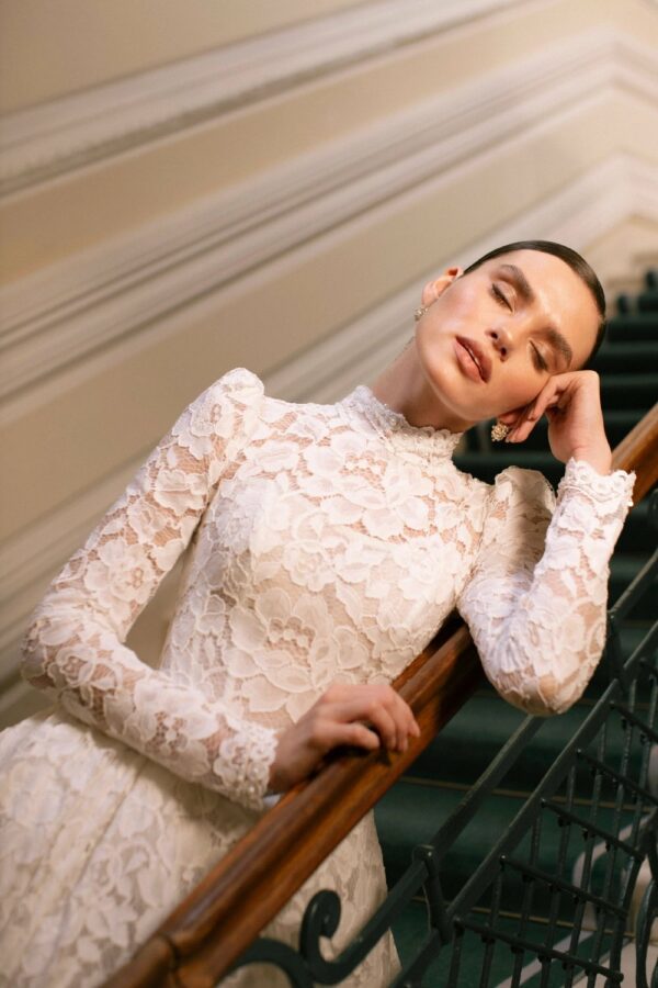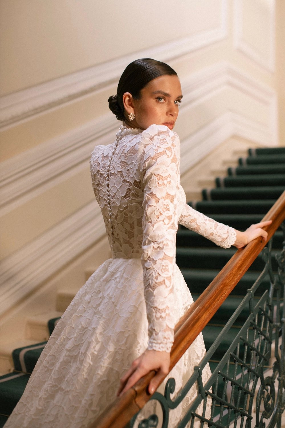 A-line wedding gown with a fitted waist and a layered train skirt. The bodice is crafted with a corset base softened by layers of sheer mesh, overlaid with delicate corded lace. The sculpted waistline in a pointed shape emphasizes the elegance of the silhouette, while the open lace-up back adds a refined touch. Slim lace sleeves with gathered shoulders and a high stand-up collar are embellished with sequins and beads, with scalloped lace edges creating a graceful detail. The full skirt, made of corded lace, mikado, and layers of soft and structured tulle, is gathered into deep pleats at the waist, giving extra volume and a sense of grandeur. Customizable options include a non-sheer corset in ivory or nude shades.