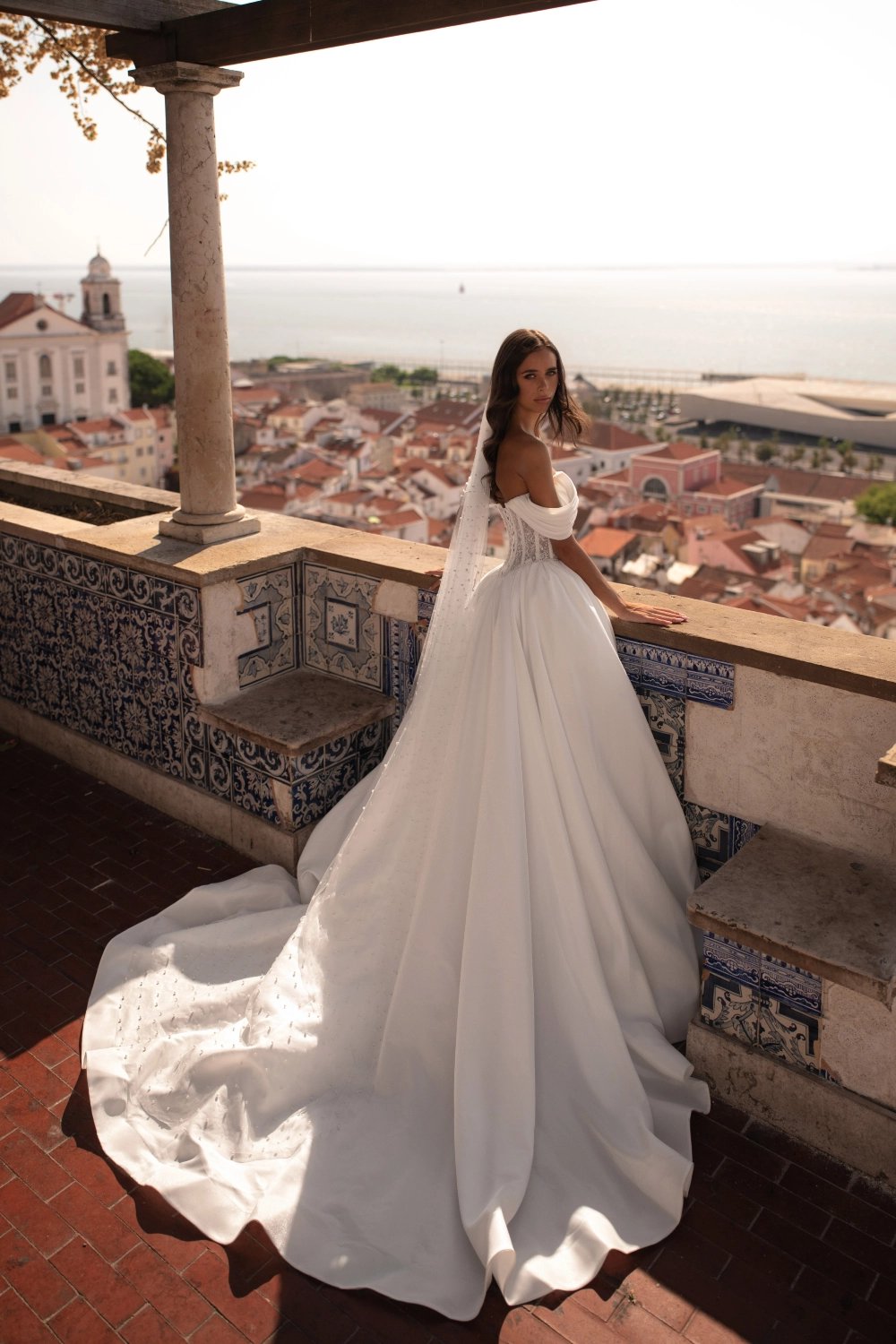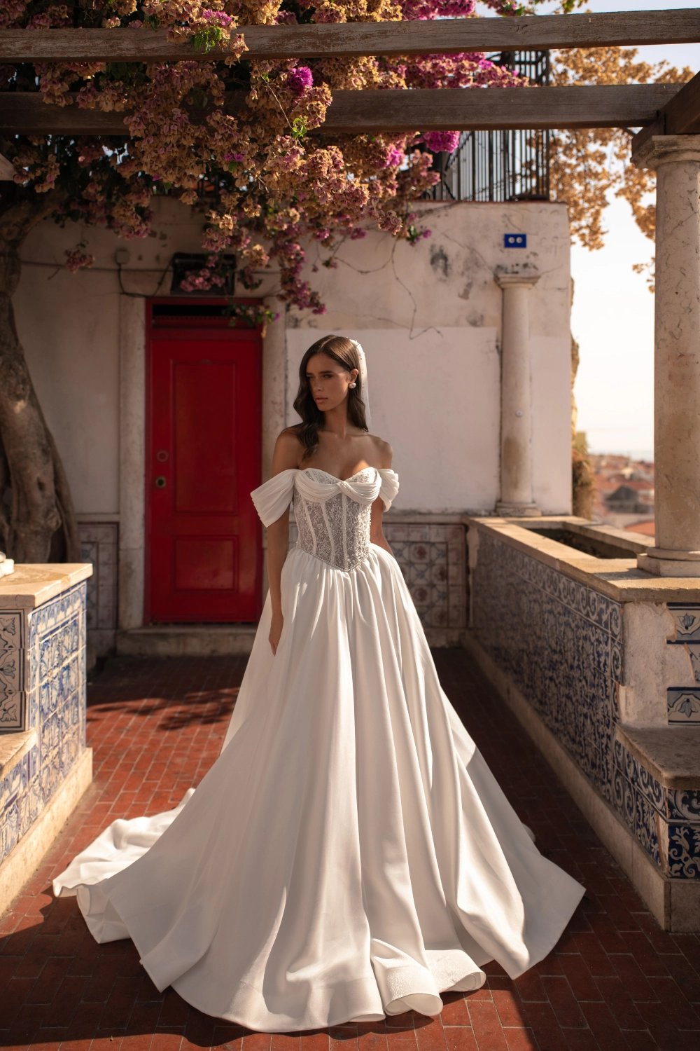 An elegant A-line wedding dress perfectly highlights feminine curves. The semi-sheer sculpted corset with neckline is covered in delicate embroidered Chantilly lace; the bust features fantasy draping that flows into voluminous off-shoulder straps, secured at the back and adorned with strands of shimmering pearls. The multi-layered satin skirt has a soft noble sheen, full and flowing, with dense gathers at the waist and a luxurious long train. The waistline is accented with a narrow ribbon of sparkling pearls for a final touch of luxury.