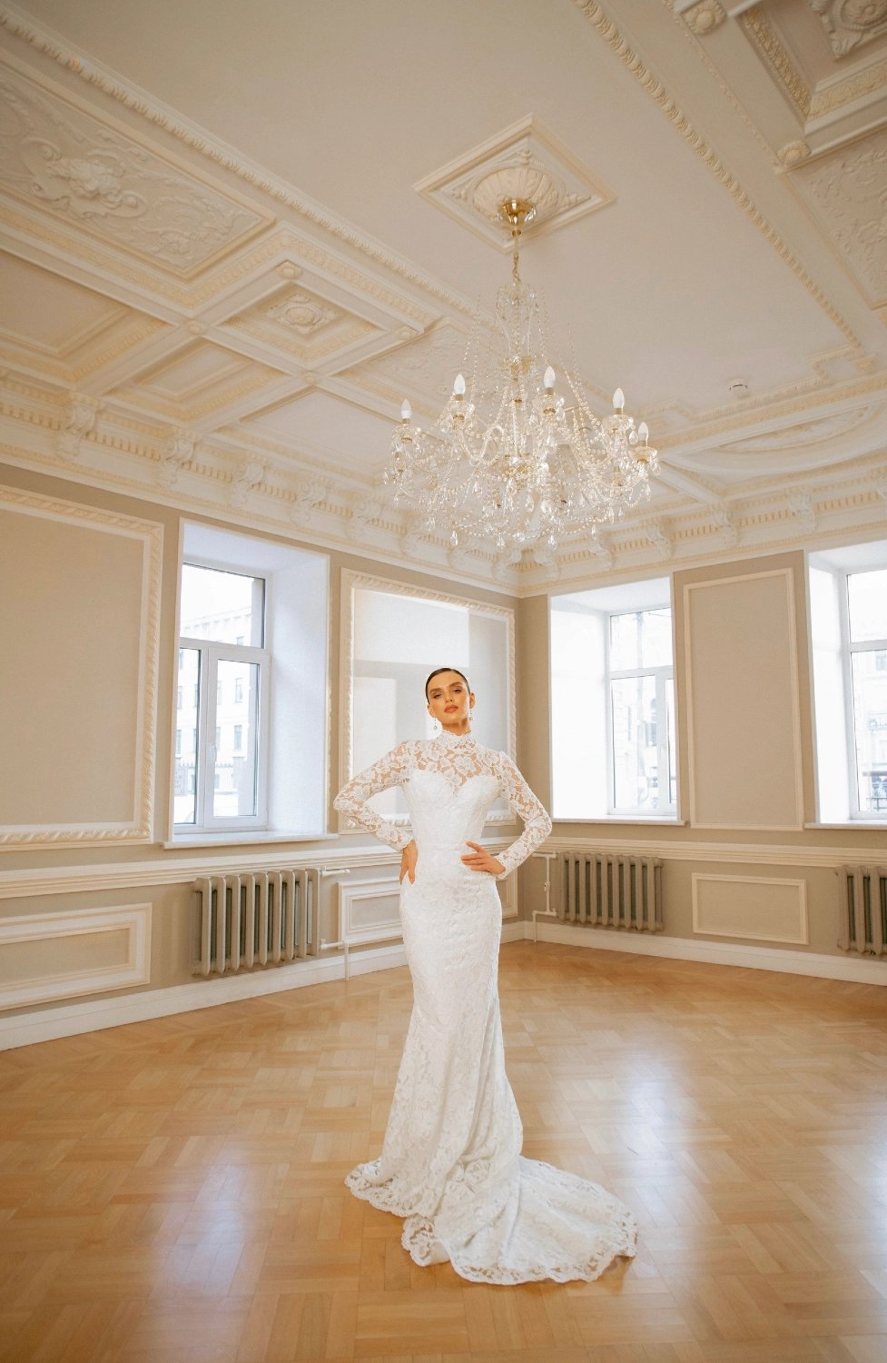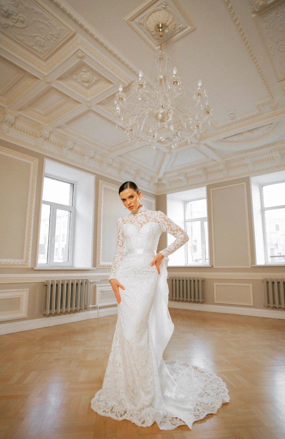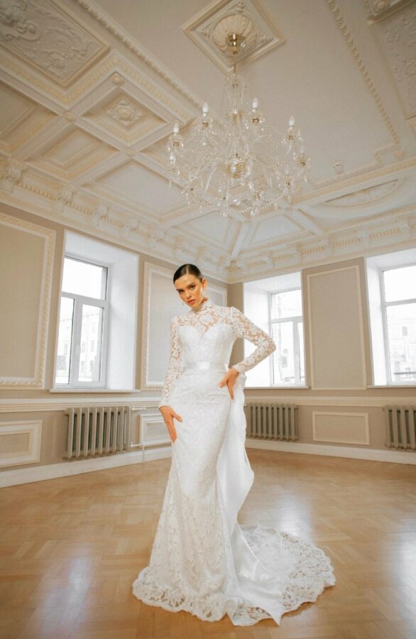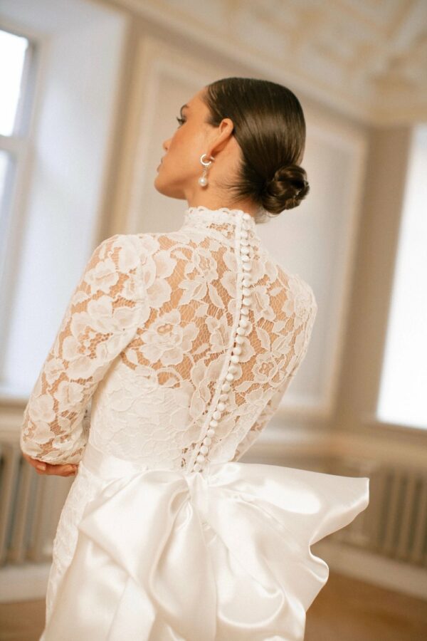 A mermaid-style wedding gown designed with elegant lines and refined details. The bodice combines a structured corset and a delicate corded lace overlay. The corset features a sweetheart neckline and open lace-up back, accentuating the waist and ensuring a flawless fit, while the lace overlay with slim sleeves, a high collar, and scalloped edges adds sophistication. The skirt gradually flares from the knees into a long, flowing train. Shaped seams and flared panels create graceful movement with every step, while the scalloped hemline completes the look with a polished finish. A removable satin belt with a voluminous asymmetric bow offers a striking accent, transforming the gown into an even more dramatic statement.