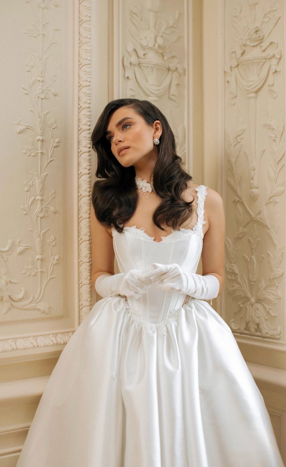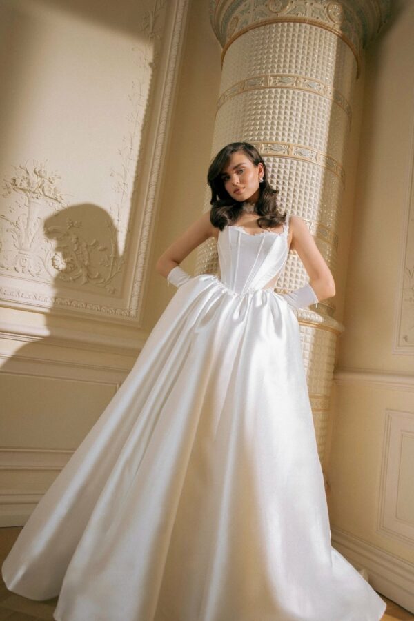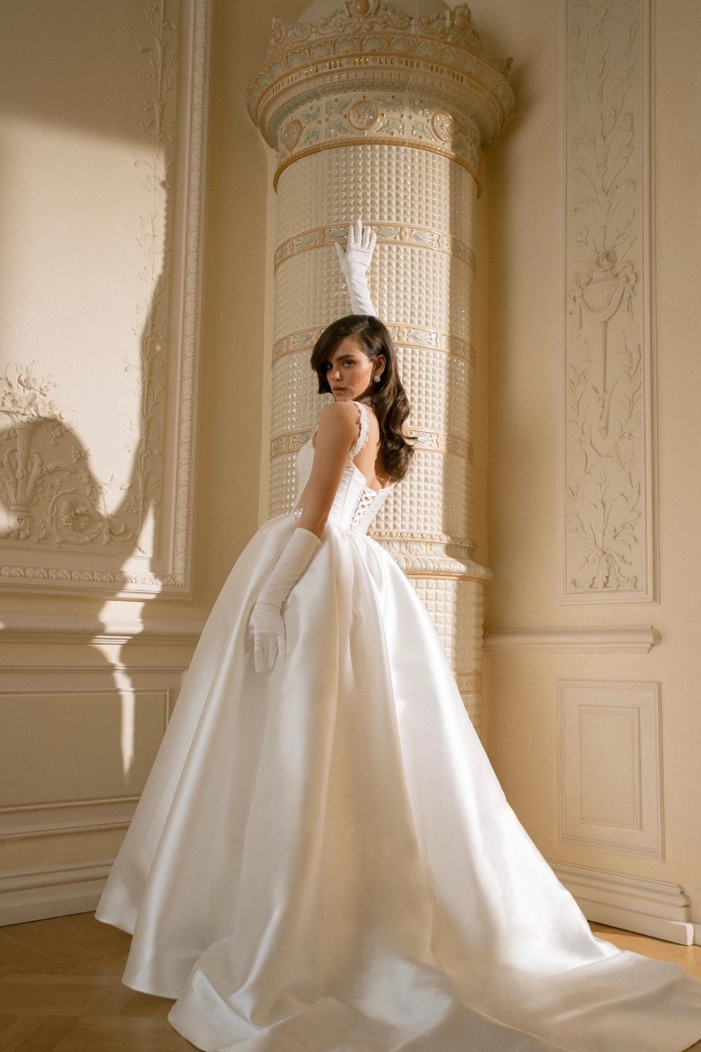 A princess-style wedding gown that embodies regal volume and refined detailing. The structured corset features a deep neckline with almond-shaped cups, delicately embellished with beaded embroidery that flows onto the straps. Sheer milk-toned mesh side panels and a pointed waistline create the illusion of a slimmer silhouette, while the open lace-up back adds an elegant finish. The multi-layered skirt with a long train is gathered at the waist, with paneled inserts adding lightness and movement. Side pockets bring a modern touch, while the detachable peplum and crinoline hem enhance the fullness of the skirt. The waistline is accentuated with hand-crafted decorative elements, and the corset can also be made fully opaque in Verena fabric for a more classic look.