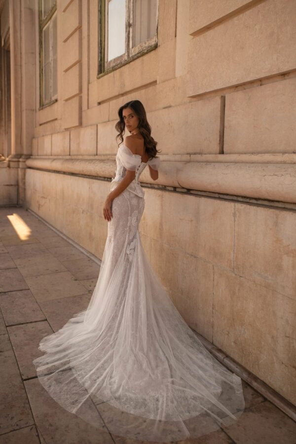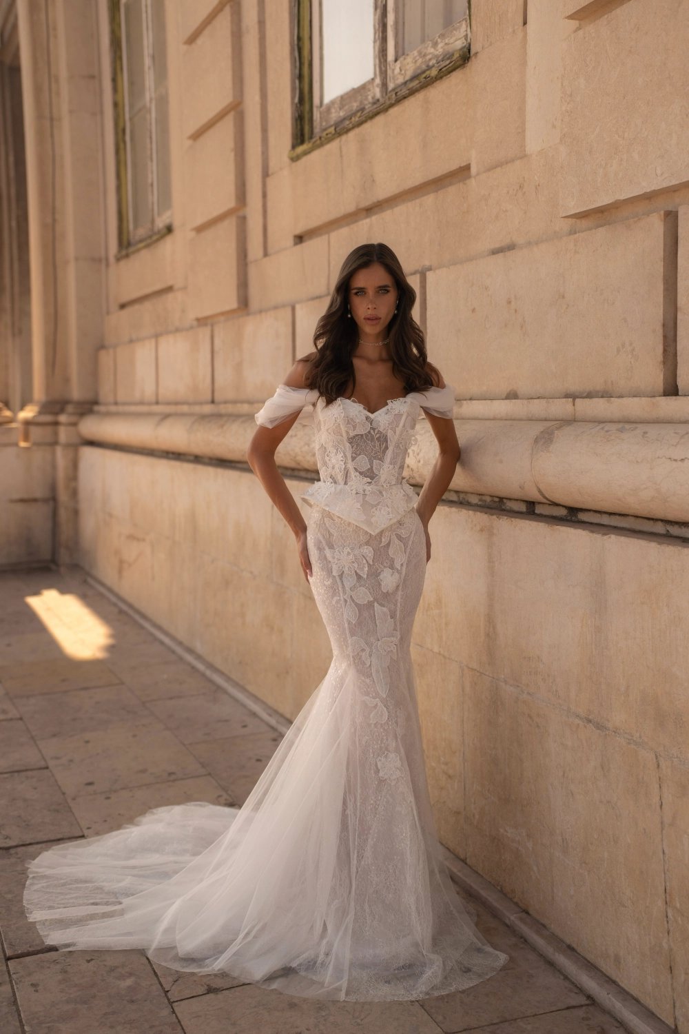 A wedding duo: sculpted corset paired with either an A-line skirt or a mermaid skirt. The exquisite corset is structured and seductive, covered in Chantilly lace with shimmering sequins and bold 3D flowers. A sweetheart neckline gently frames the bust. A detachable peplum with shaped edges and sharp points adds striking volume. The A-line skirt is multi-layered and weightless in chiffon, with a wrap style, dramatic waist pleats, and a slit. The mermaid skirt fits snugly over a nude base, covered in two types of luxurious lace, and flares from the knees with godets. Optional additions include detachable straps and a lightweight flowing scarf with decor. Every bride can create her dream look by mixing and matching the pieces.