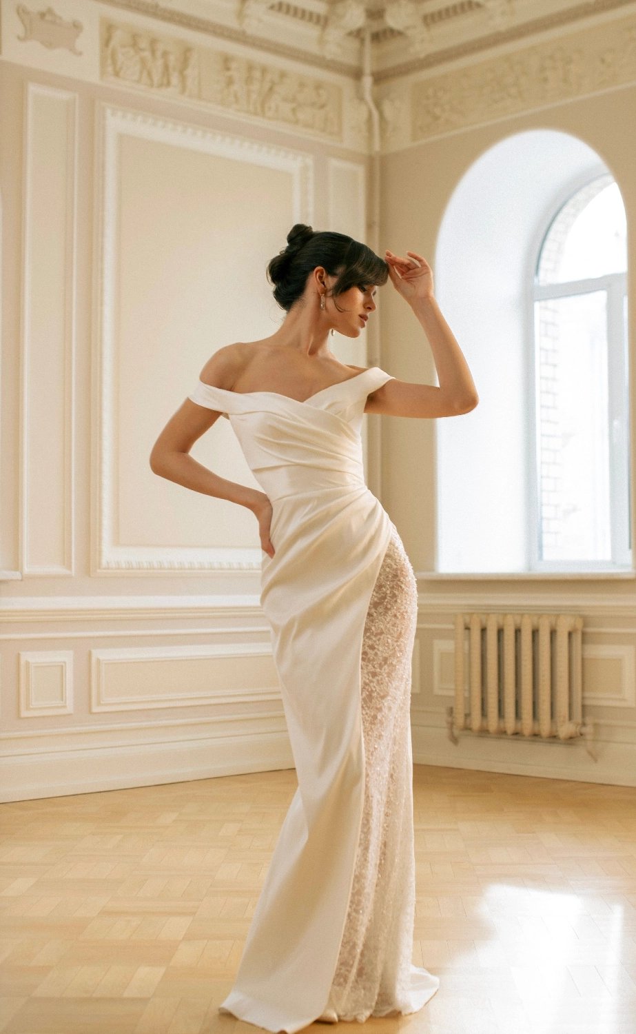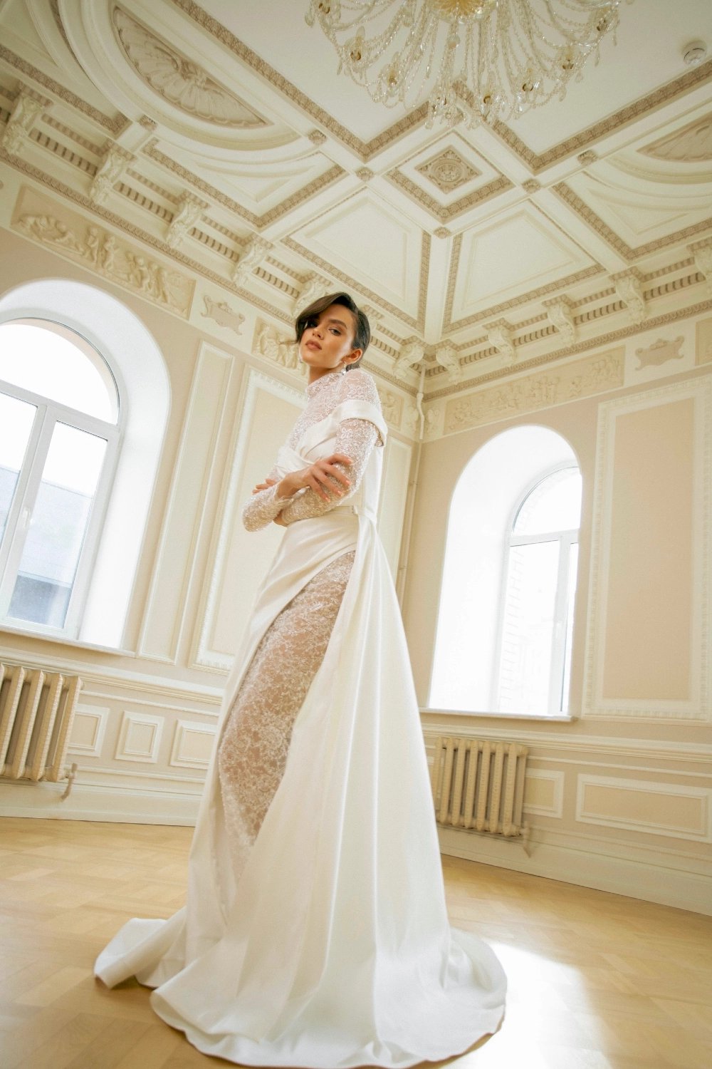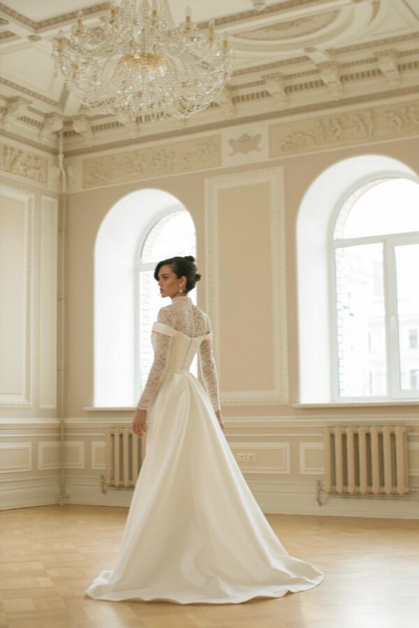 A mermaid-style wedding gown in matte stretch mikado, designed with refined details and versatile styling options. The corset bodice features horizontal straps and draping that creates a wrap-effect across the bust, softly framing the shoulders. The back is finished with structured seams and an inner lace-up fastening with hooks along the edge. The skirt flares gently from the knees and is crafted in two layers: the inner layer of embroidered Chantilly lace with a scalloped hem, and the outer layer with a deep arched cutout on the left side, accented by elegant draping at the waist. The look is enhanced by a detachable mikado train, pleated at the waist and fastened with side hooks hidden by delicate beading. A removable lace blouse with a high collar and fitted sleeves finished with scalloped lace adds further sophistication. Attached at the waist with discreet loops and buttons, it allows the bride to transform the gown from a sleek to a more romantic ensemble. Customization options: skirt without a slit; alternative draping variations.