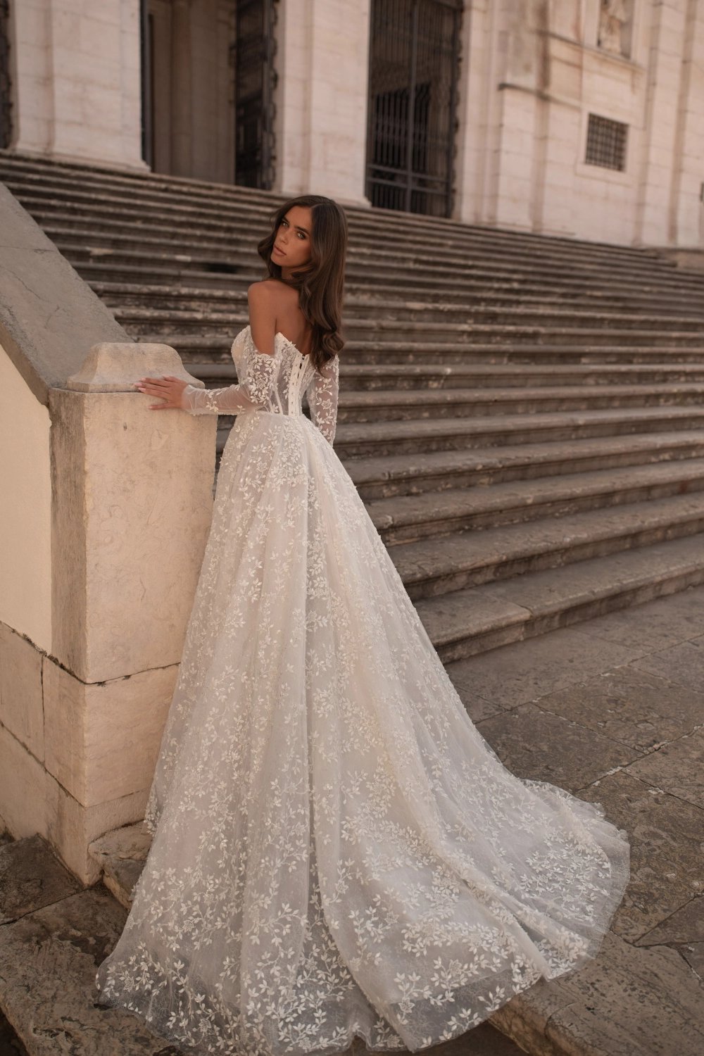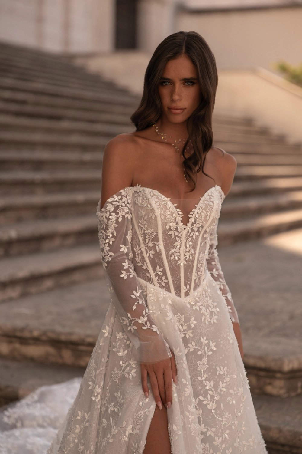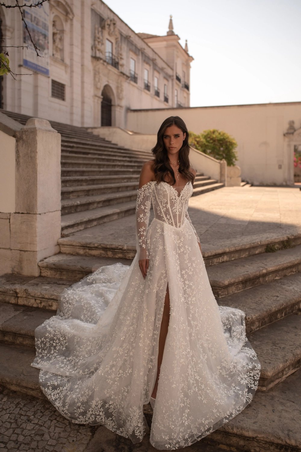 An A-line wedding dress embodying tender grace and classic romance. The exquisite semi-sheer corset features built-in sleeves that bare the shoulders, a seductive neckline, and a straight back. Luxurious shimmering decor with voluminous lace branches flows seamlessly from the bodice to the skirt. The two-layered airy skirt has a playful wrap, striking slit, soft waist pleats, hidden pockets, and a luxurious flowing train, leaving a trail of dreamy beauty behind the bride.