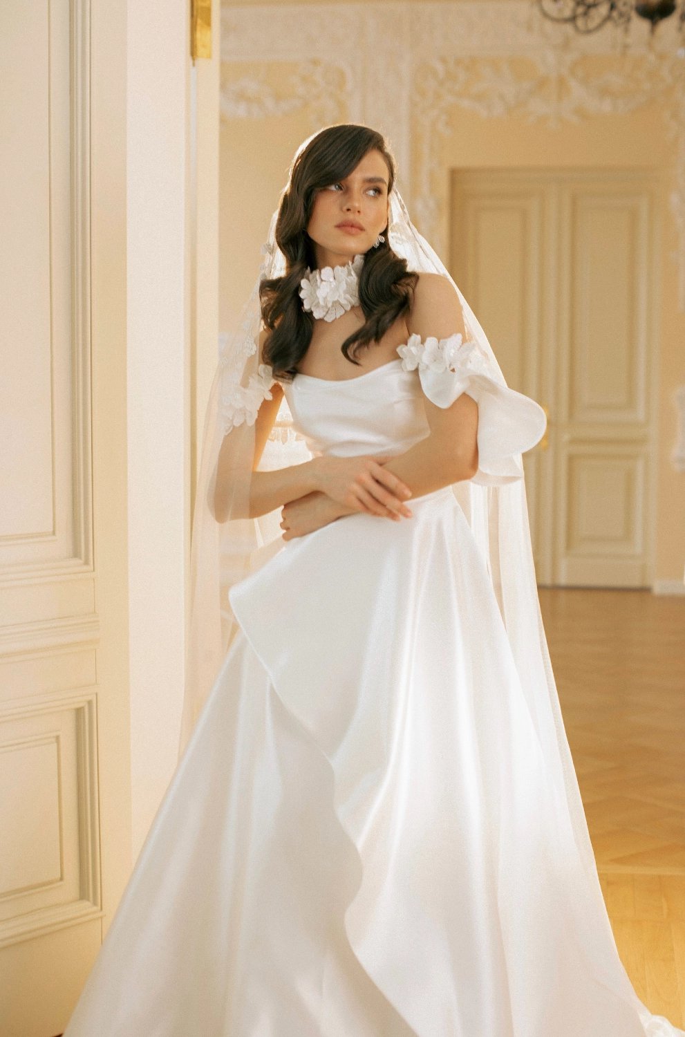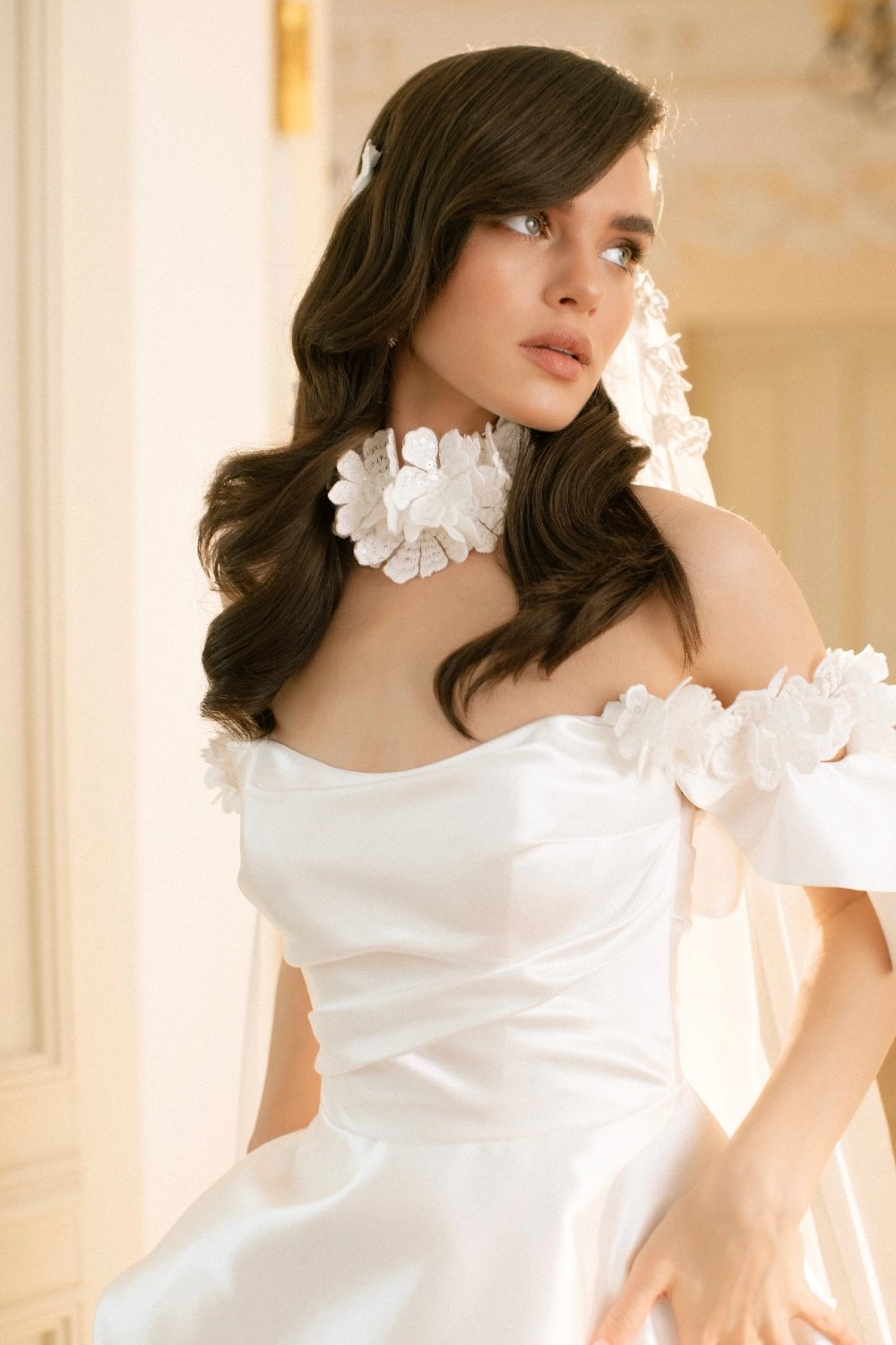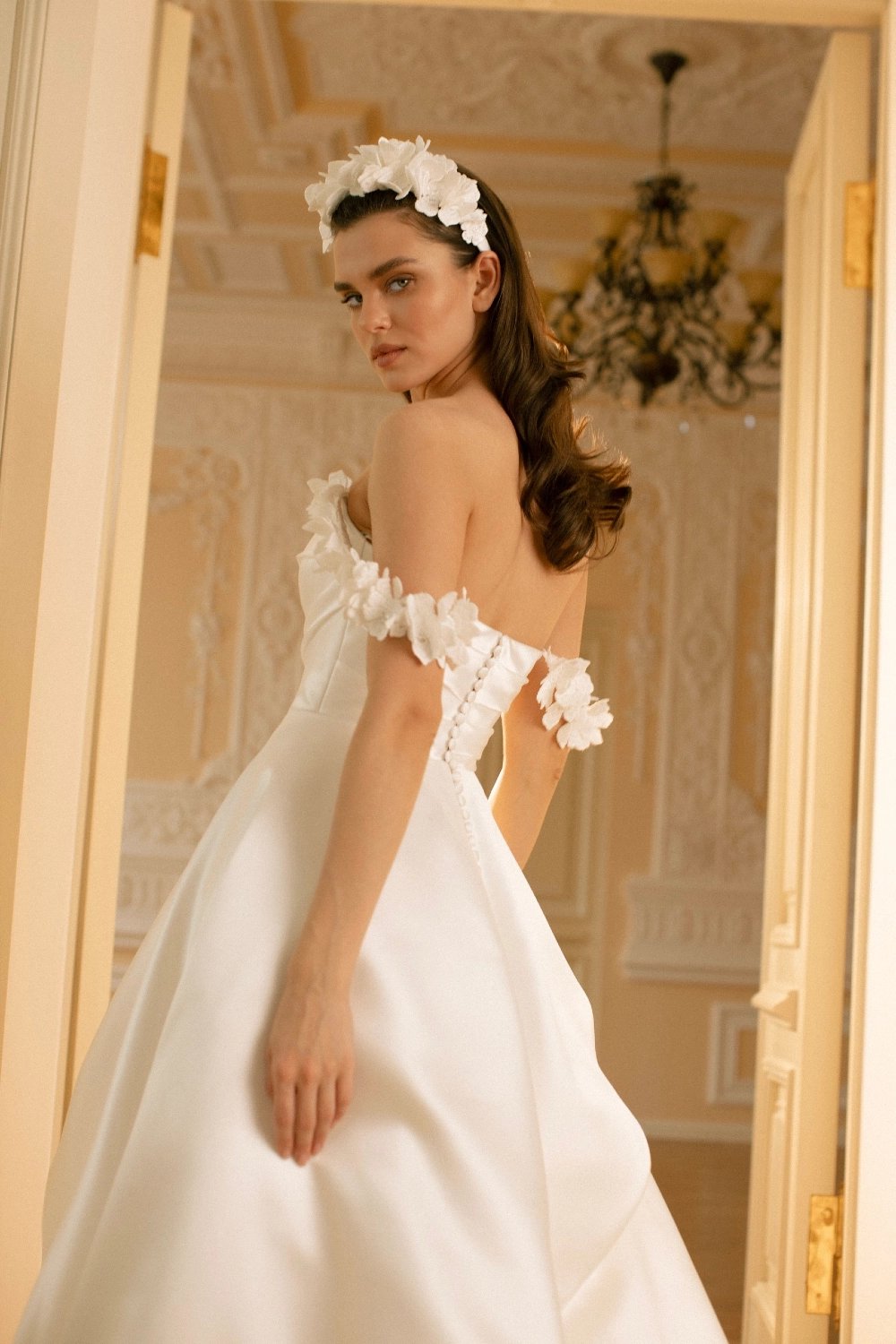 An A-line wedding gown with a structured corset draped in satin with a soft sheen. The fastening features an inner lace-up and hooks, concealed by a decorative row of buttons. The layered skirt with a sweeping train is accented by a dramatic asymmetric flounce, buttoned along the back seam, adding movement and a contemporary touch. The look is complemented by interchangeable details: delicate straps adorned with 3D flowers, pleated flounce straps, and a floral choker, allowing the bride to transform the mood of the gown from romantic to dramatic. Customization options: the gown can be made without the upper flounce, with pleats, or with a slit in the “Vada” style.