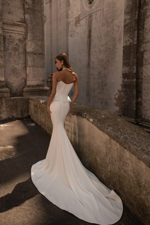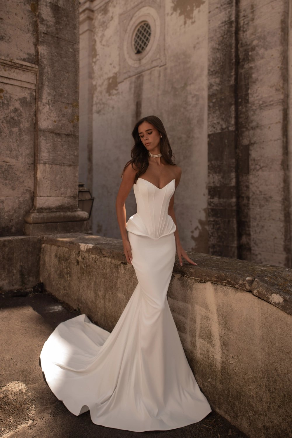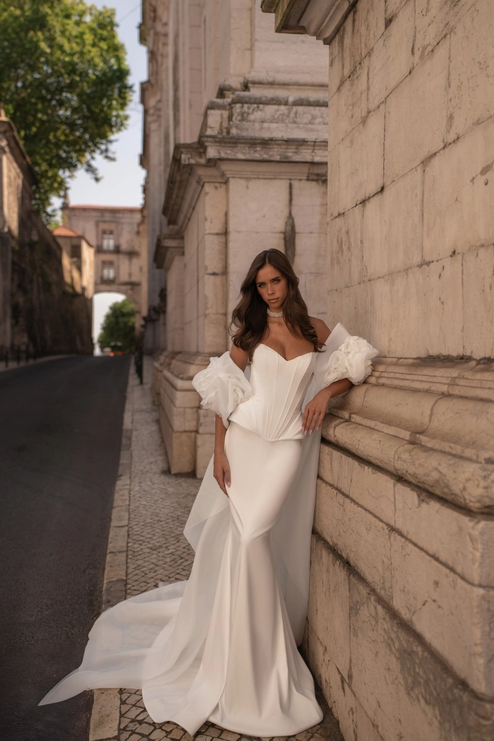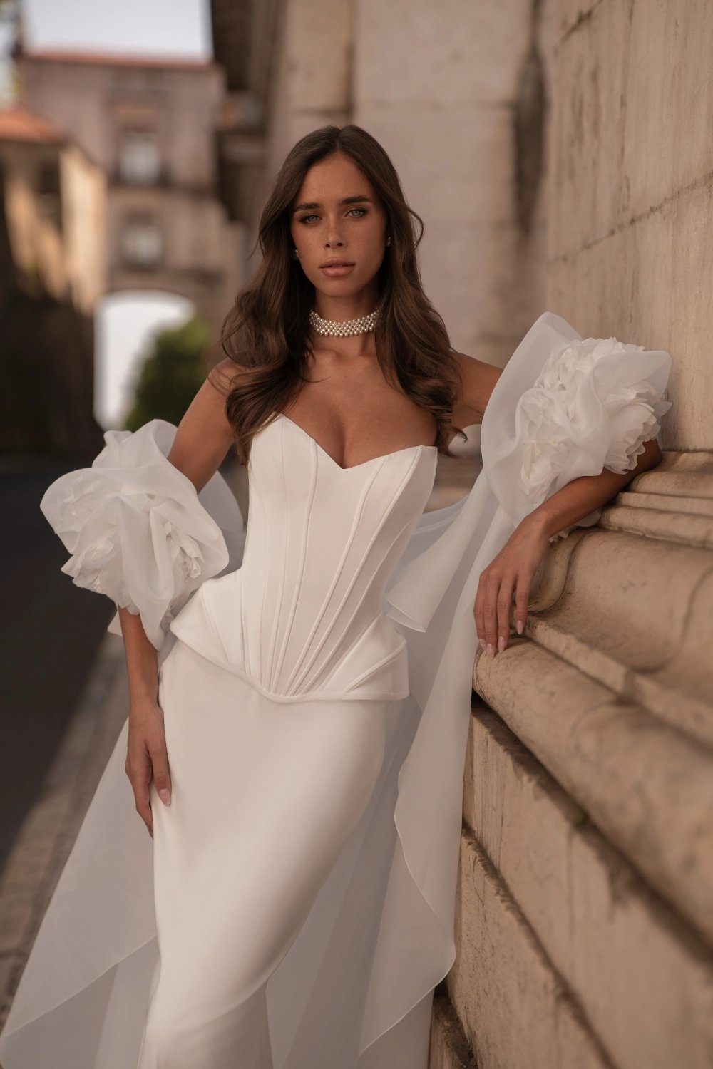 A luxurious bridal ensemble: corset, skirt, and cape for an irresistible bride. The seductive matte satin corset features a shaped sweetheart neckline. Bold central seams, voluminous side arches, and open back lacing perfectly accentuate the figure.The fitted skirt has a luxurious train with minimal flare. The fantasy cape in weightless milky organza includes puffed sleeves, wing-like details, large handmade flowers, swing draping, and a long train, adding fairytale magic.