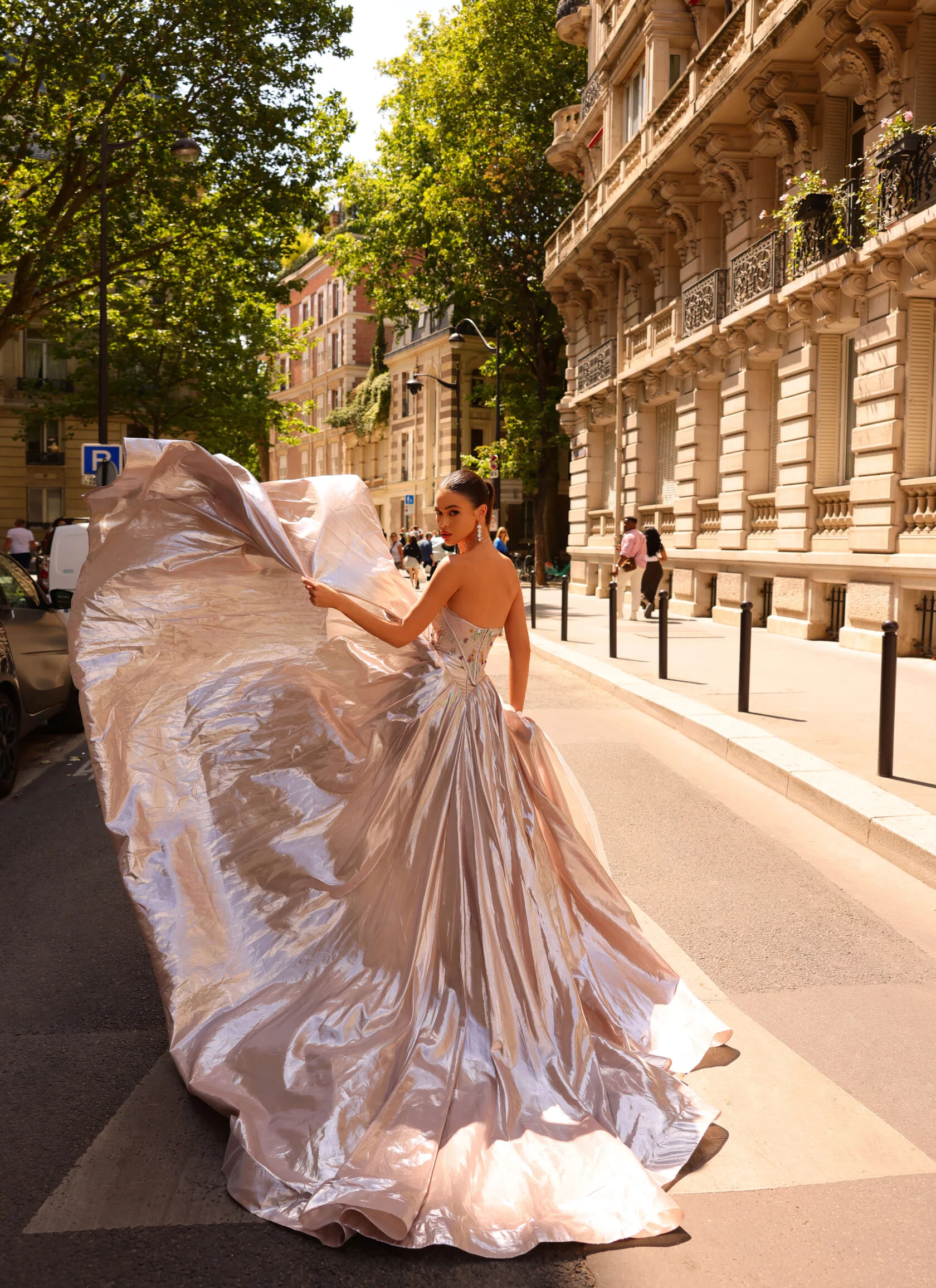 The brilliant wedding set consists of a silk corset embroidered with stones, beads and sequins and a natural silk skirt with a long train.