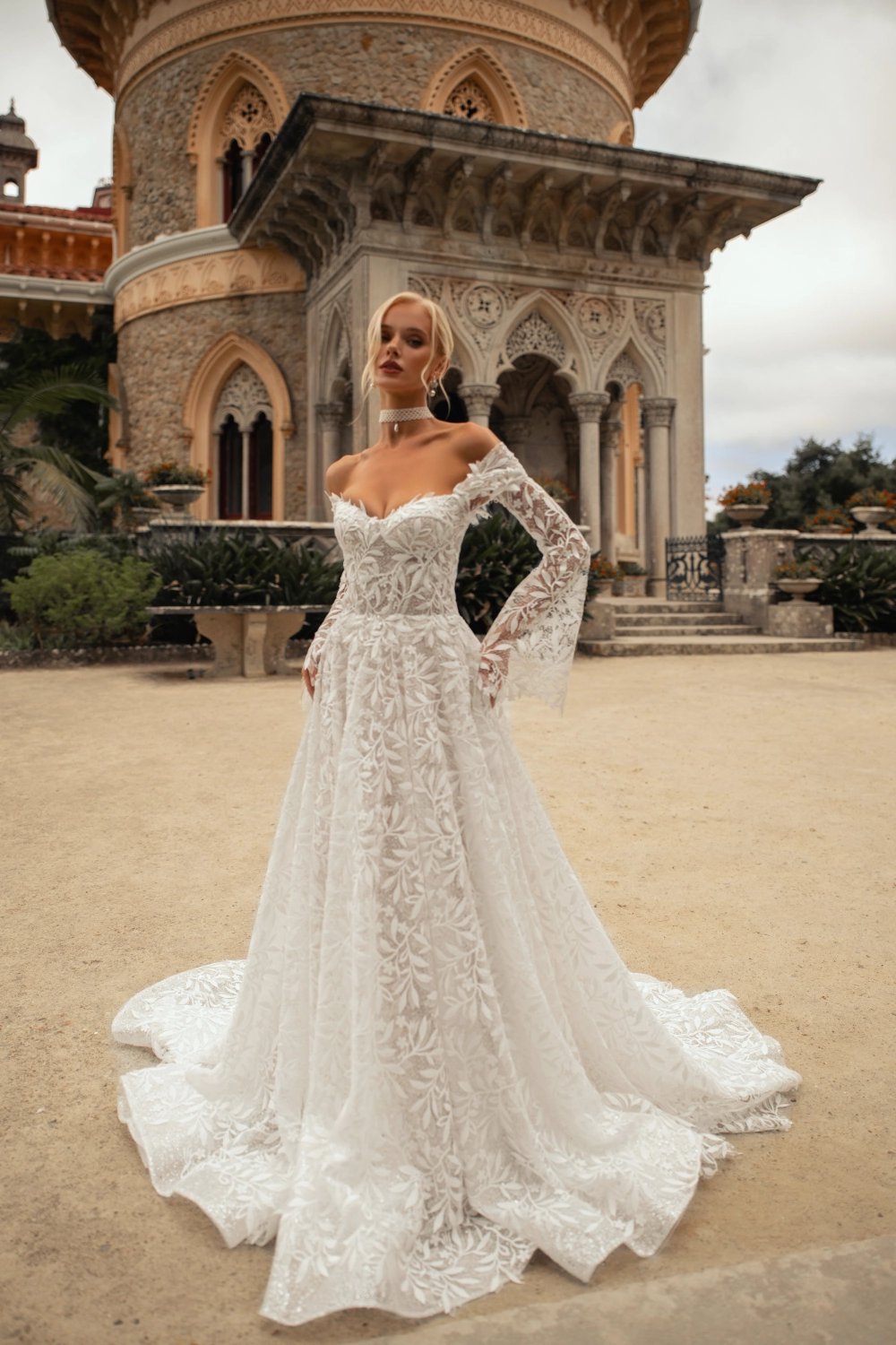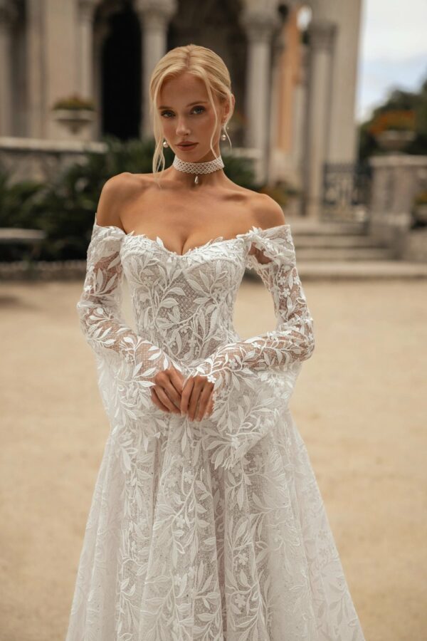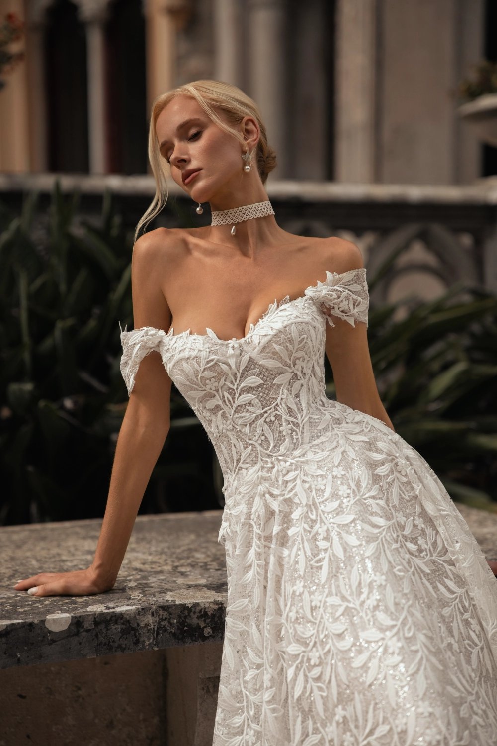 A princess-style wedding gown with a corset bodice and a layered skirt with a sweeping train. The semi-sheer corset with push-up cups is adorned with eco-silk, shimmering tulle, and lace, while velvet ribbons emphasize the structured lines. The skirt is crafted from lightweight eco-silk with voluminous layers of glittering tulle, finished with a lace overlay that mirrors the bodice. The look can be transformed with detachable lace sleeves or airy wings made of blush-toned tulle and lace for a more romantic effect. Customization options: ivory lining; open lace-up back.
