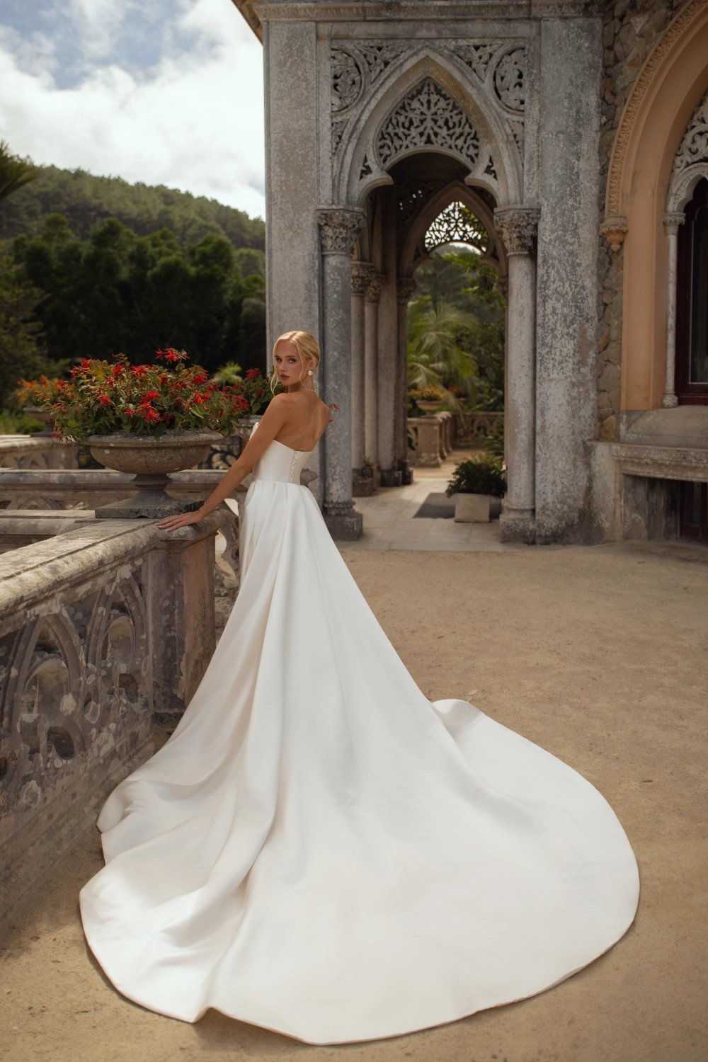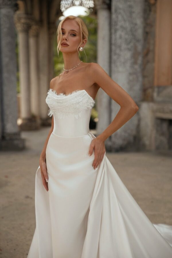 A mermaid-style bridal ensemble with a detachable train. The structured satin corset with an open lace-up back is embellished with hand-applied lace for a refined finish. The fitted skirt with subtle flare and a back slit highlights the silhouette, while the detachable satin train, attached with hooks, adds volume and grandeur. Pleats and an additional basque ensure beautiful structure and movement. Customization options: inner lace-up back; detachable sleeves or wings.