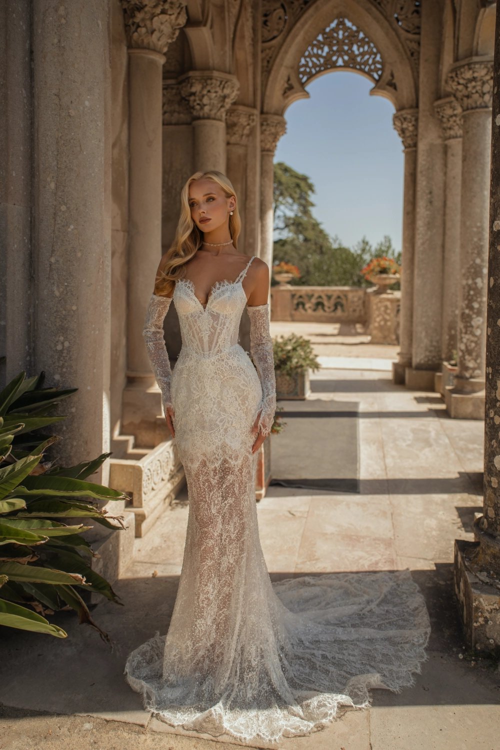 A versatile bridal set designed for transformation. At its core is a mini dress with an open lace-up back and beaded strap detailing. The look can be elevated with a lace overskirt with a small train, a high-collar blouse with long sleeves, or detachable flared sleeves. For a more dramatic effect, the set includes a satin corset with a detachable train, embellished with beads and delicate accents. All pieces can be mixed and matched, allowing the bride to create anything from a bold mini look to a classic silhouette. Customization options: ivory or blush lining, inner lace-up back, detachable wings.