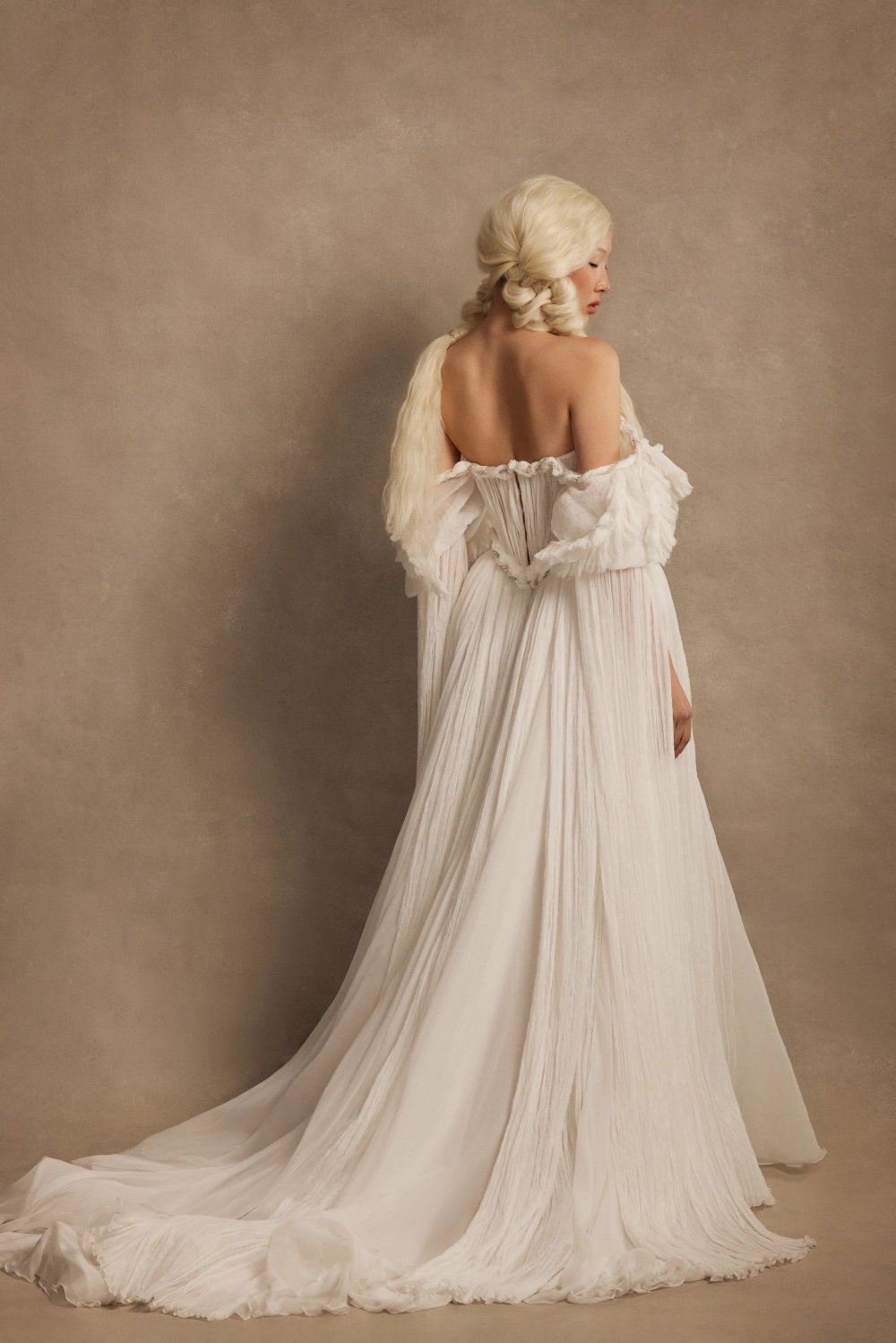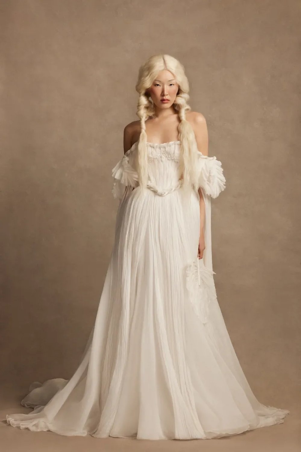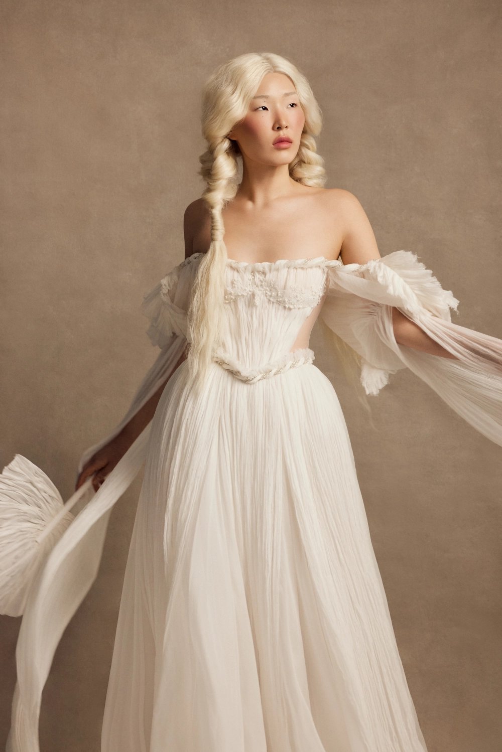 An A‑line wedding gown with voluminous sides and a square neckline. The semi‑sheer structured corset features internal lacing, lace‑covered cups, silk draping, corded lace accents, and a hand‑braided beaded tassel at the center. Long crinkled‑silk sleeves with puff caps and silk feathers can be worn on or off the shoulders.