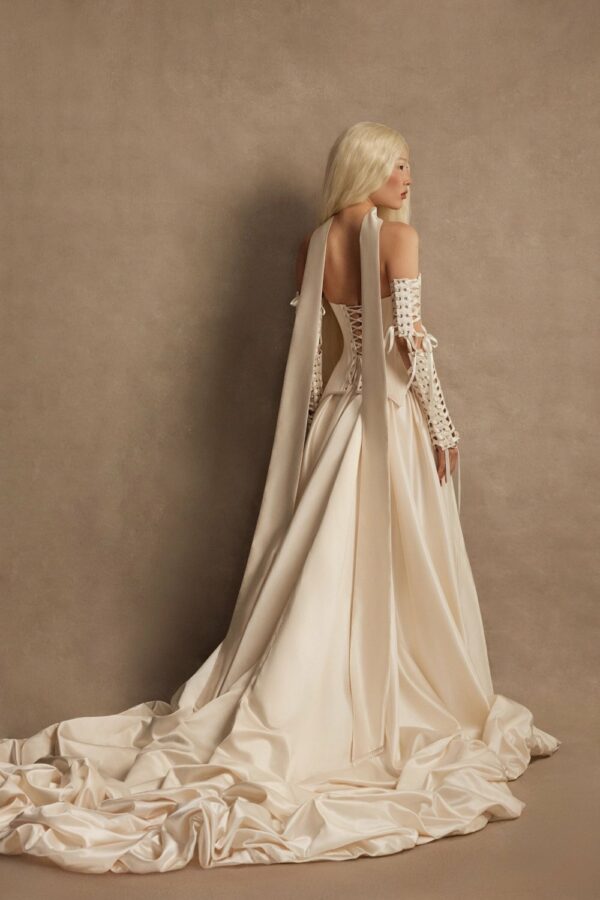 The detachable satin train includes internal mesh layers for structure and volume, finished with gathered detailing.