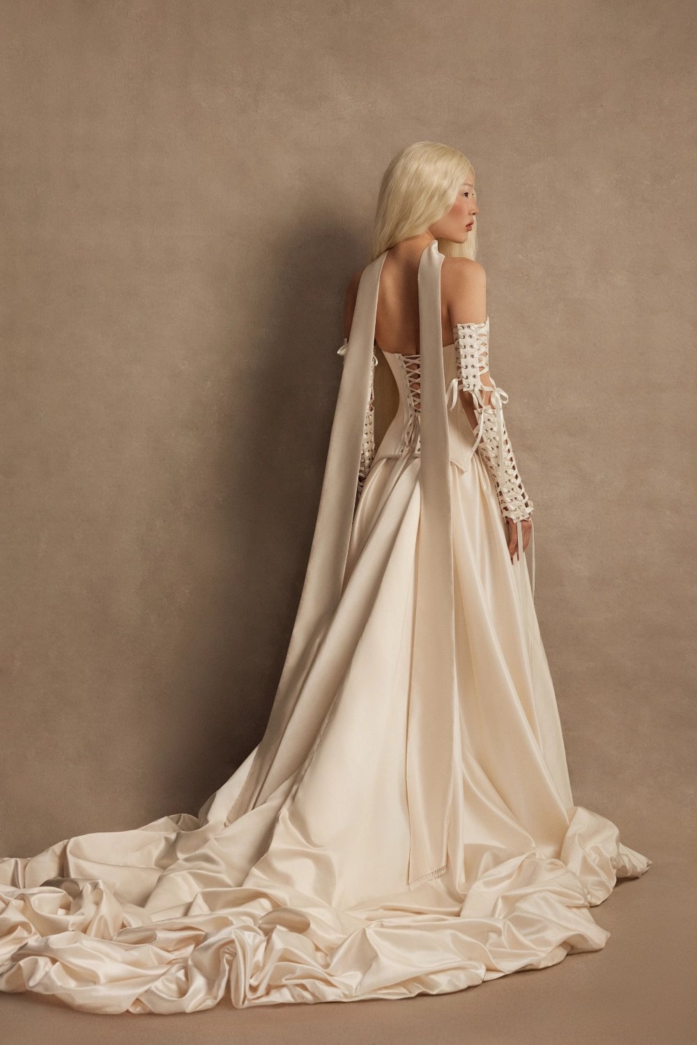 A bridal set in creamy satin, featuring a corset, mini skirt, detachable train, and scarf.