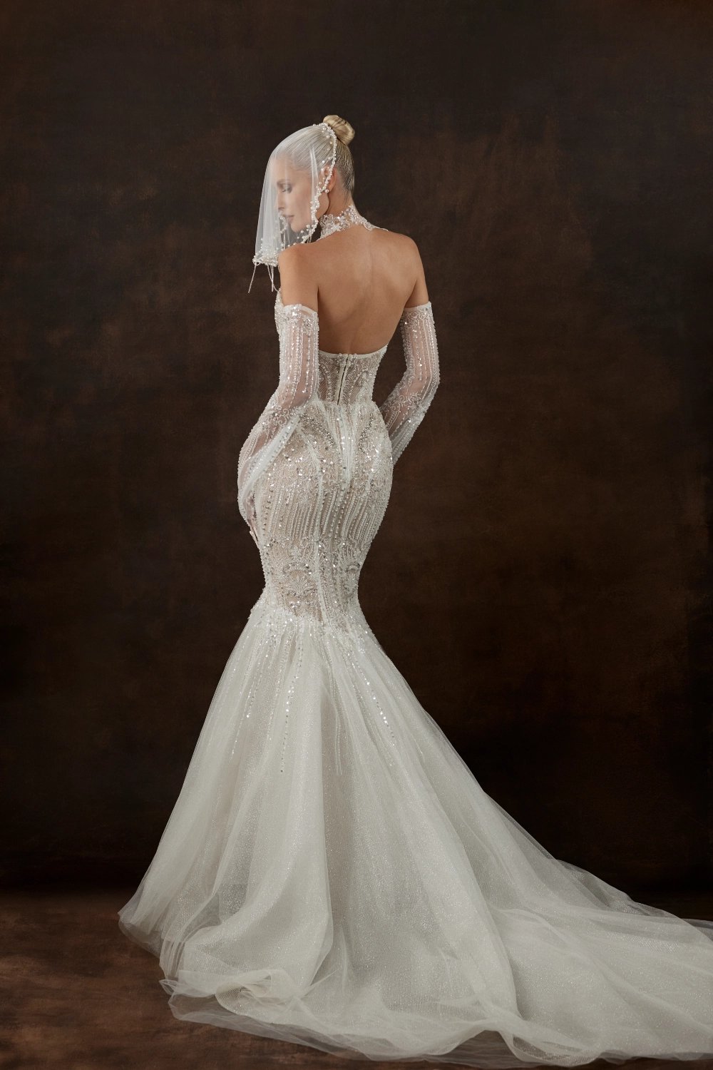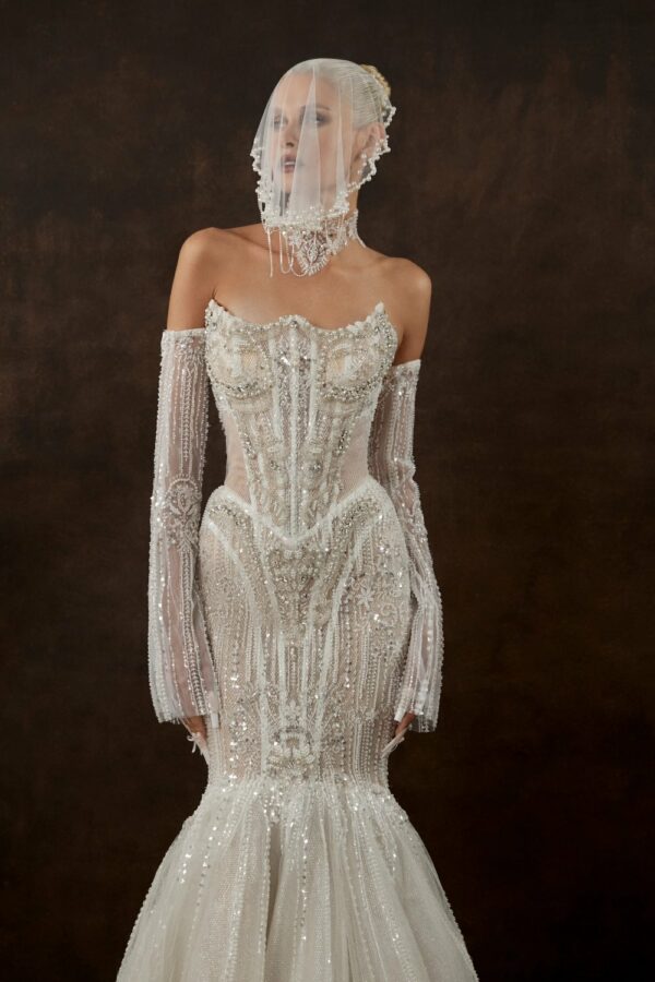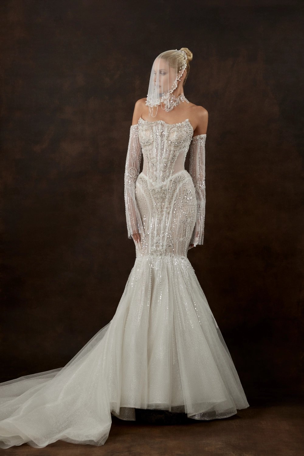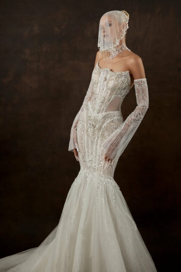 A fitted wedding dress with elegant flare: sculpted corset and long skirt with a luxurious flowing train. The corset has a shaped top, richly embroidered with sparkling rhinestones, shimmering beads, and exquisite pearls. The skirt features luxurious embroidery, cut at knee level, with a smooth flowing train transitioning into voluminous multi-layered bottoms of light tulle and glittery mesh. Long transparent sleeves, slightly flared and made of delicate lace, add airy romance to the look.