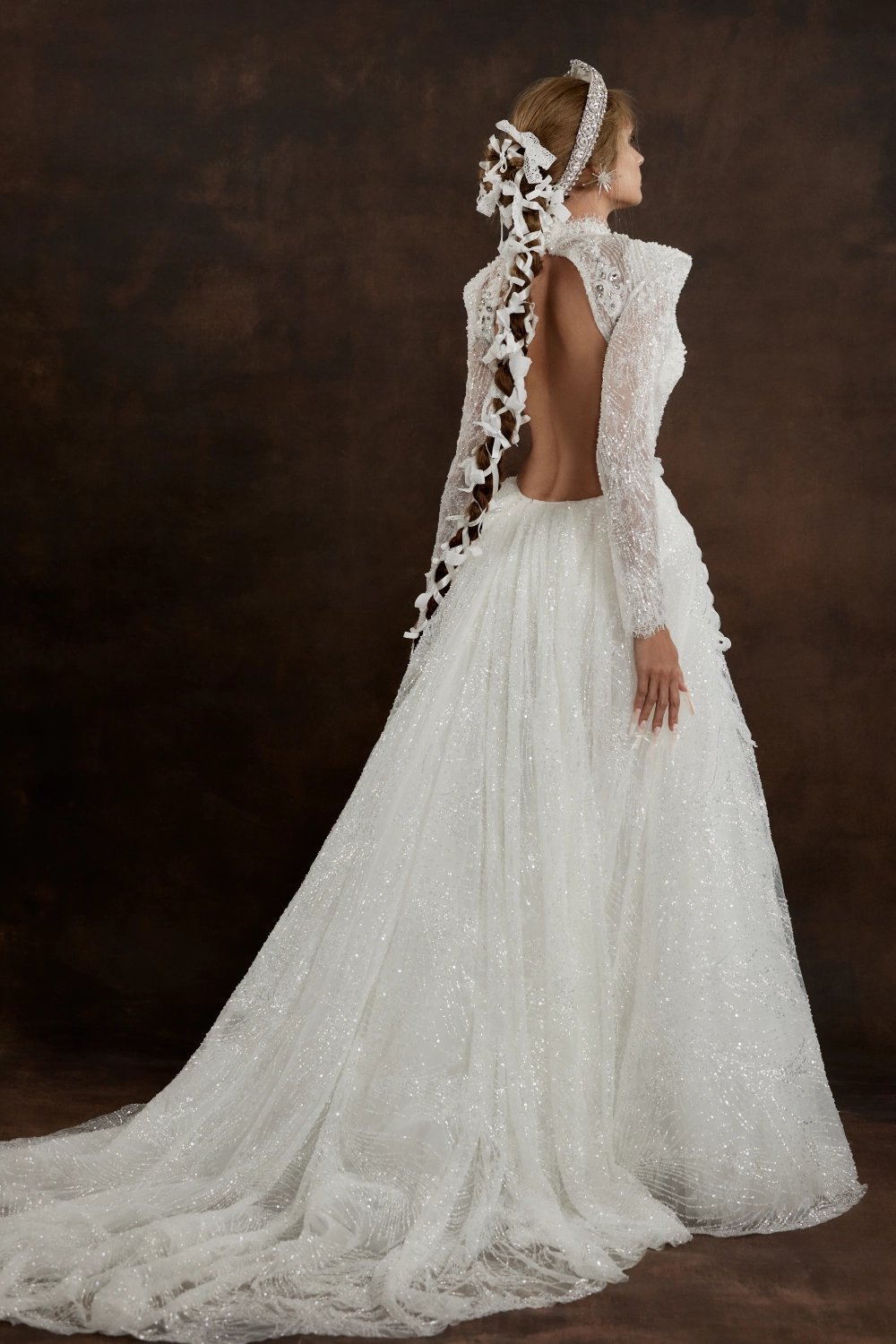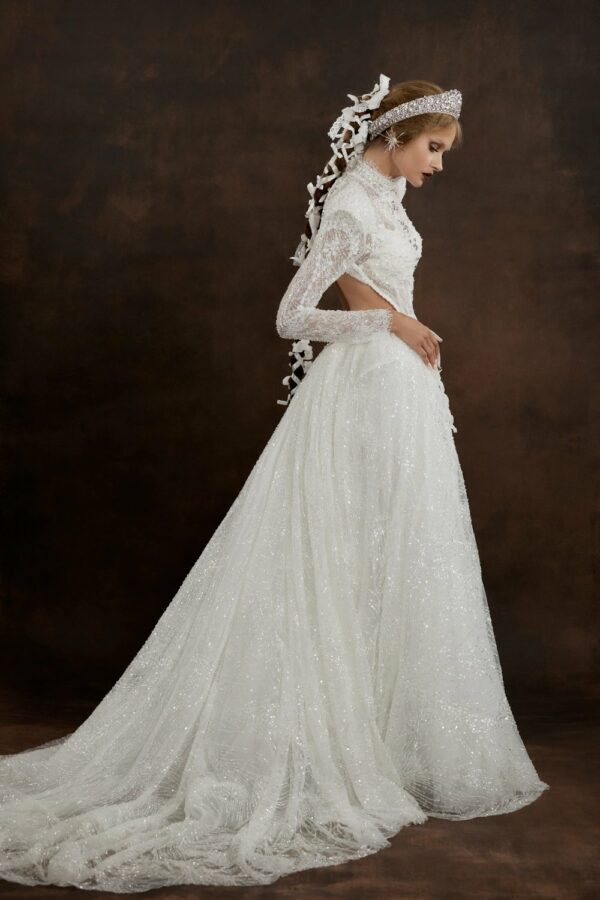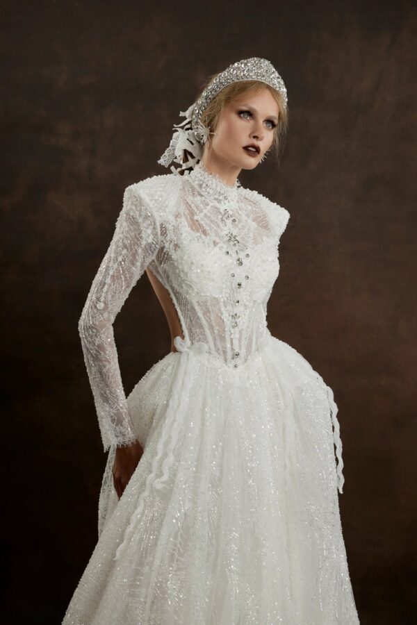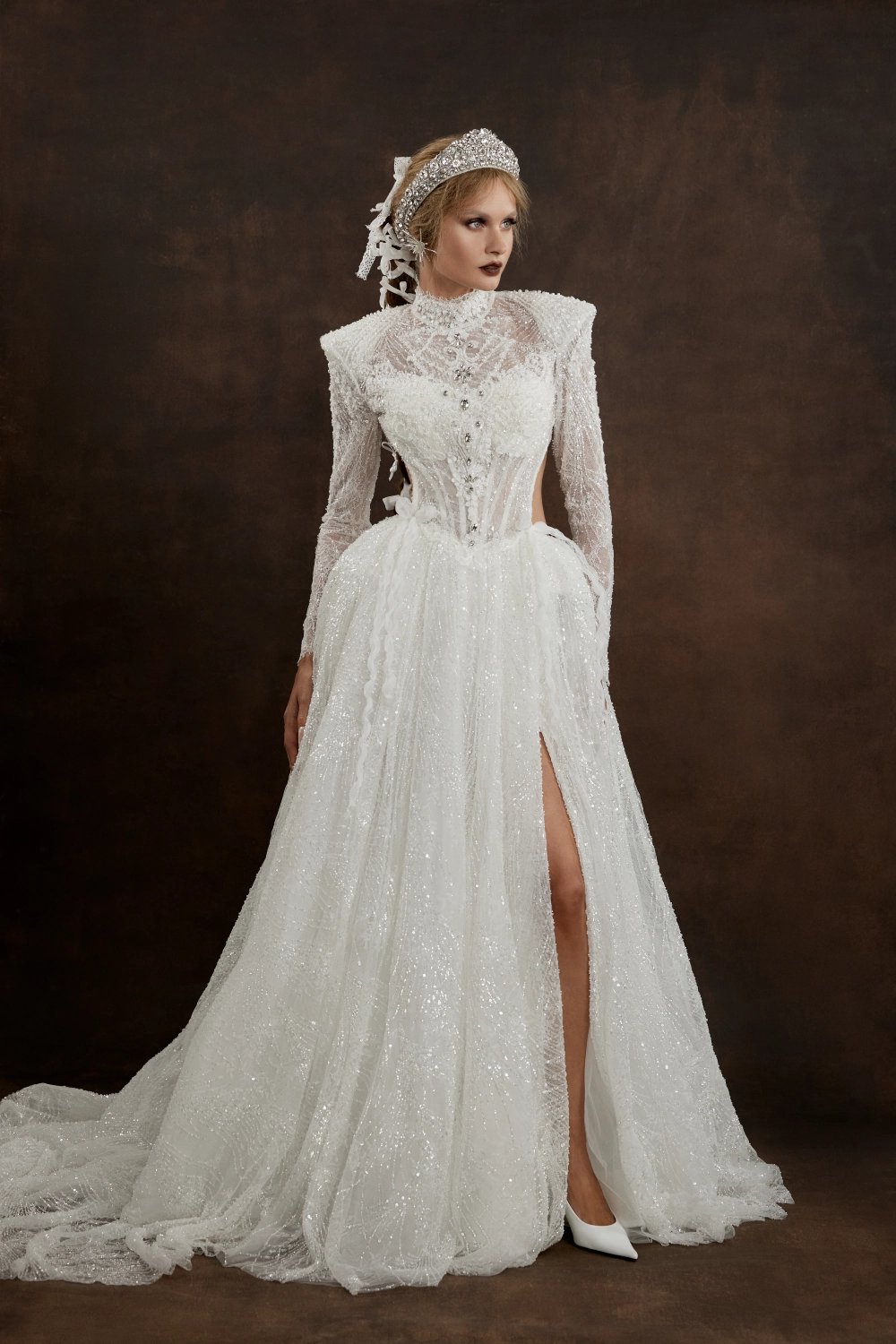 An elegant A-line dress with a sculpted corset and flowing skirt featuring a graceful train. The corset is bold and structured: a luxurious lace bodice with a high stand collar, sharp accent shoulders, and long tapered sleeves fastened with pearl buttons. Sparkling embroidery with beads, pearls, and rhinestones adds shimmer. The skirt gathers softly at the waist with a luxurious train, while a daring deep slit on the left leg adds seductive allure.