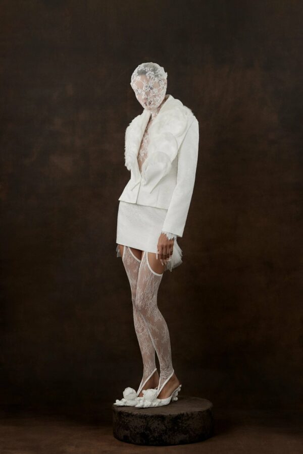 A straight-silhouette wedding set — a stylish and refined jacket and mini skirt! The elegant fitted jacket features extended shoulders, rounded pads, and a voluminous lapel collar that folds down to the waist. The back has delicate Richelieu embroidery shaped like angel wings. The tapered playful mini skirt is adorned with stitched ruffles.